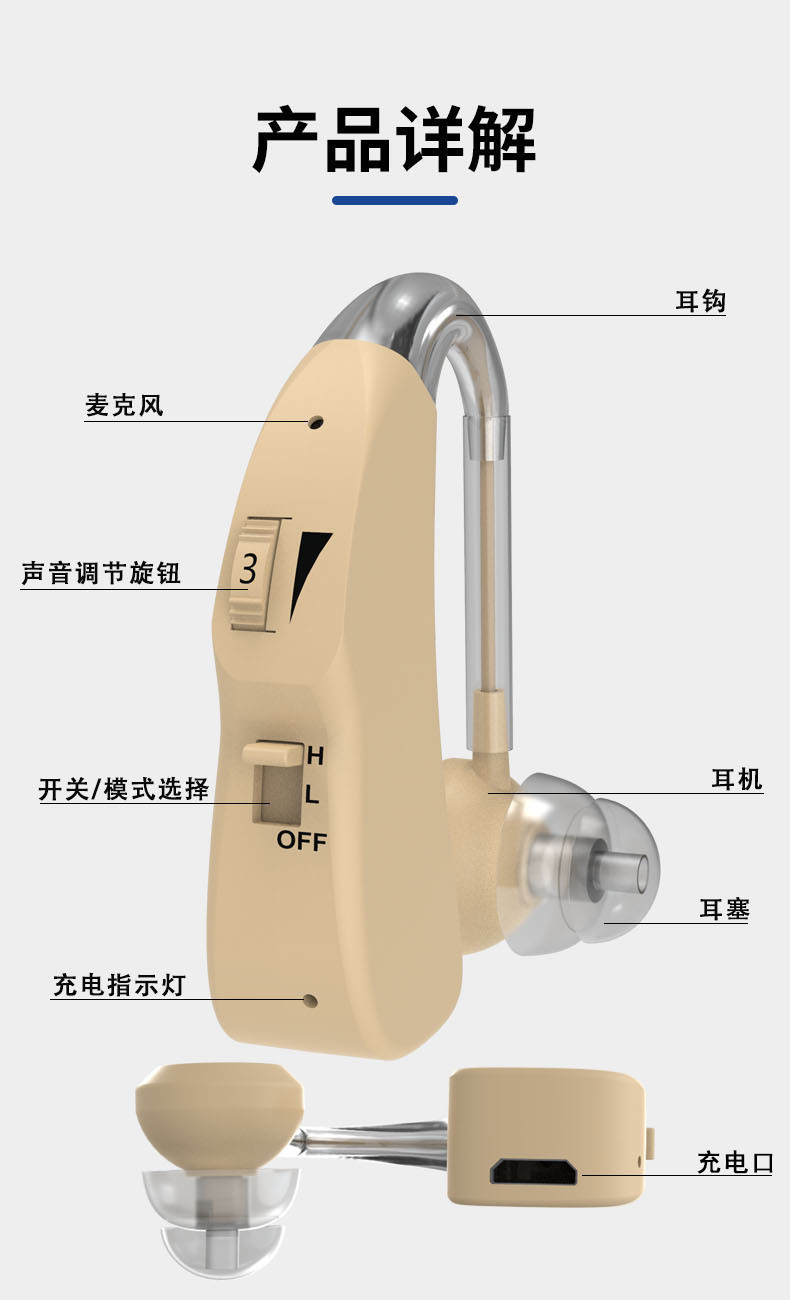 音声増幅器老人補助聴力金耳掛け充電式補聴器部品卸売りhearing aid