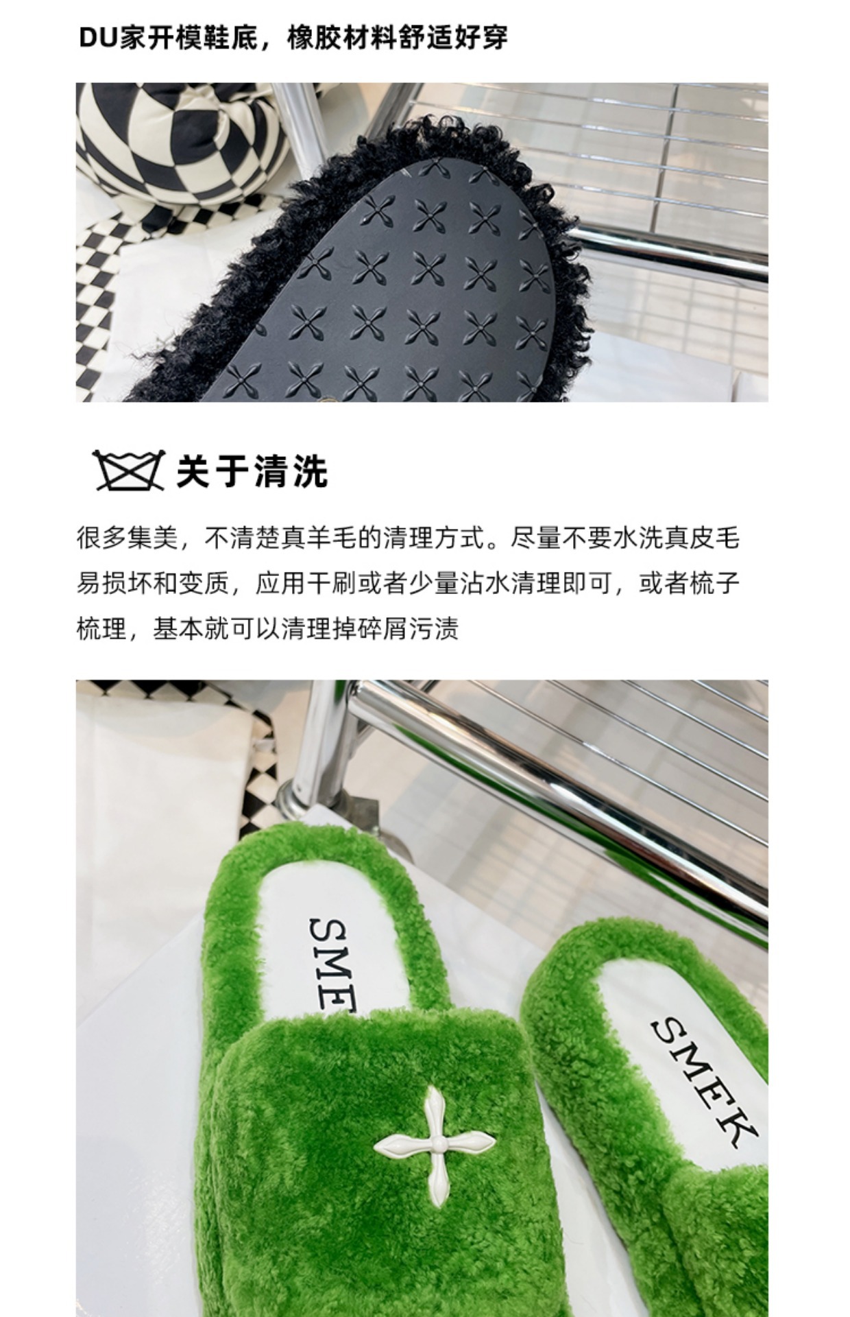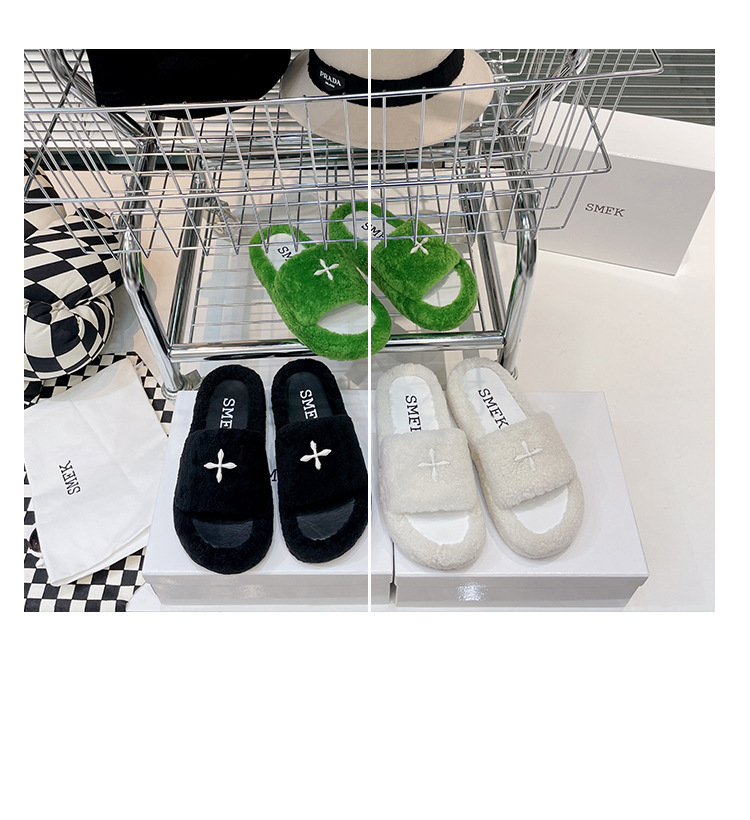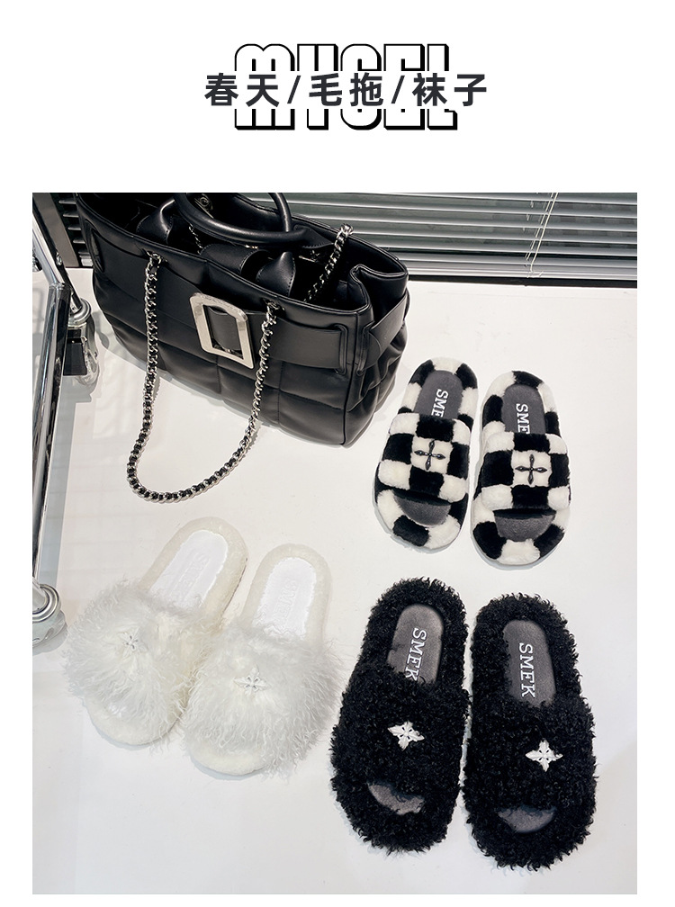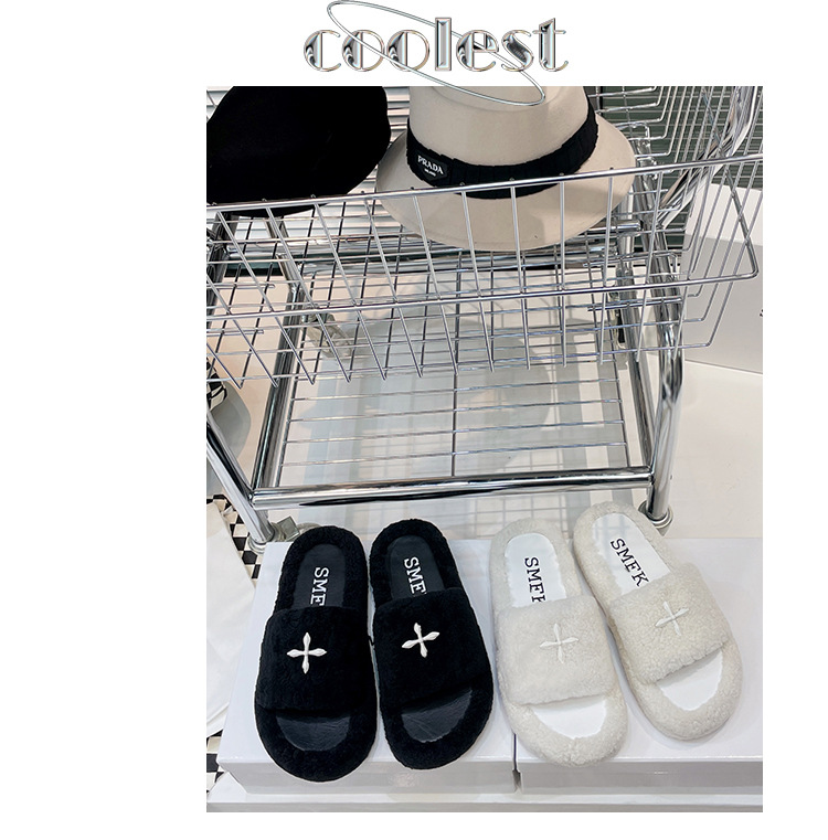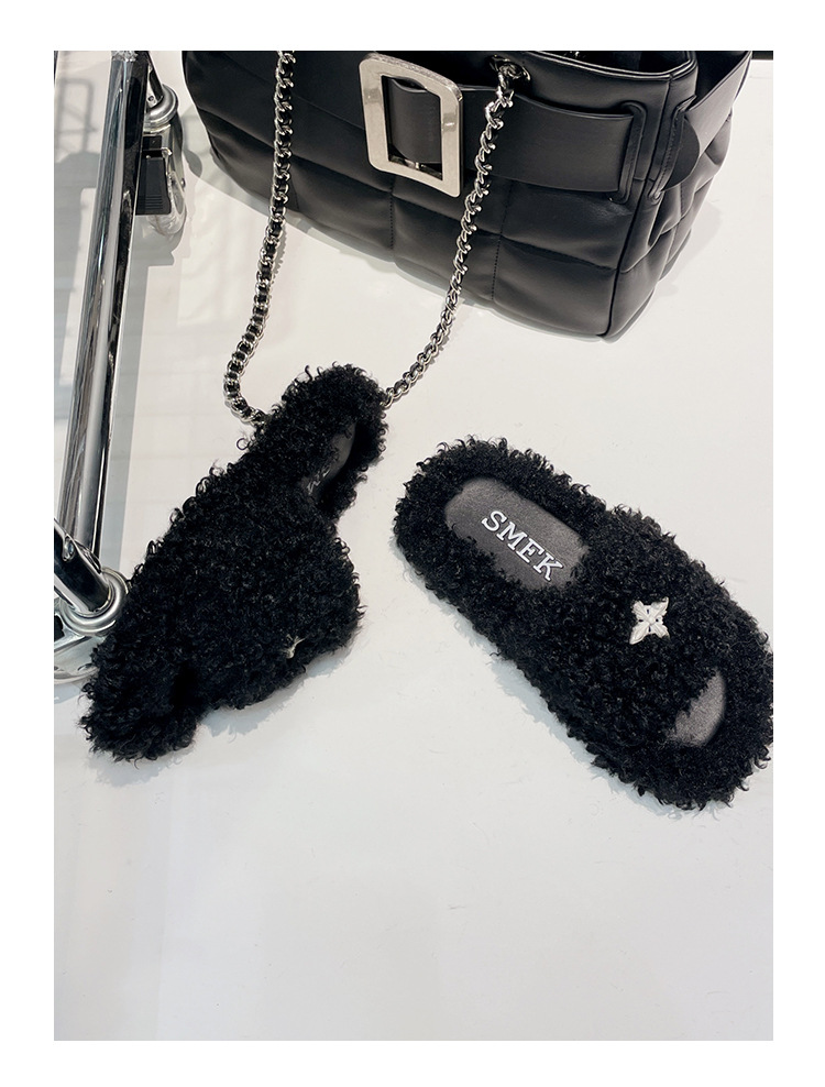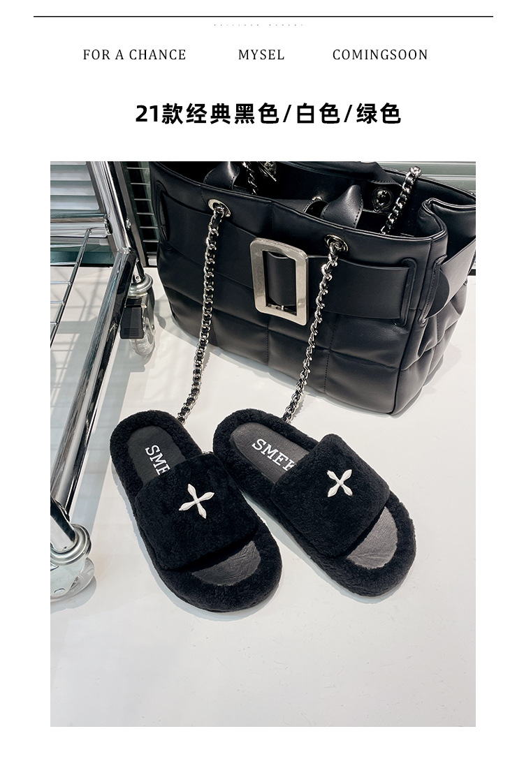 吴宣仪同款SMFK黑色毛毛拖鞋外穿十字花羊羔毛一字拖厚底毛毛拖鞋