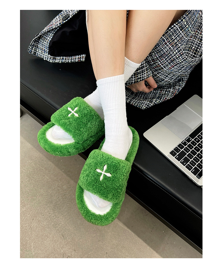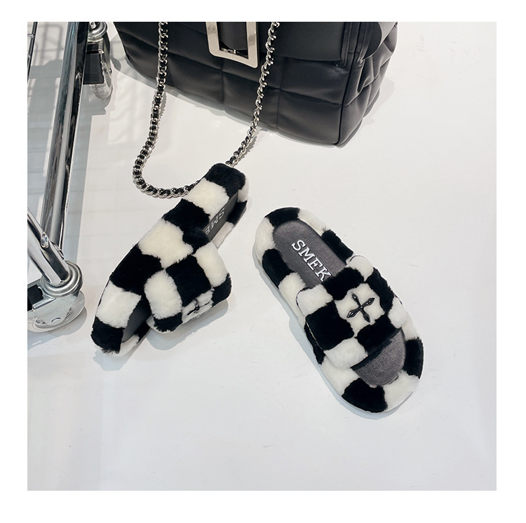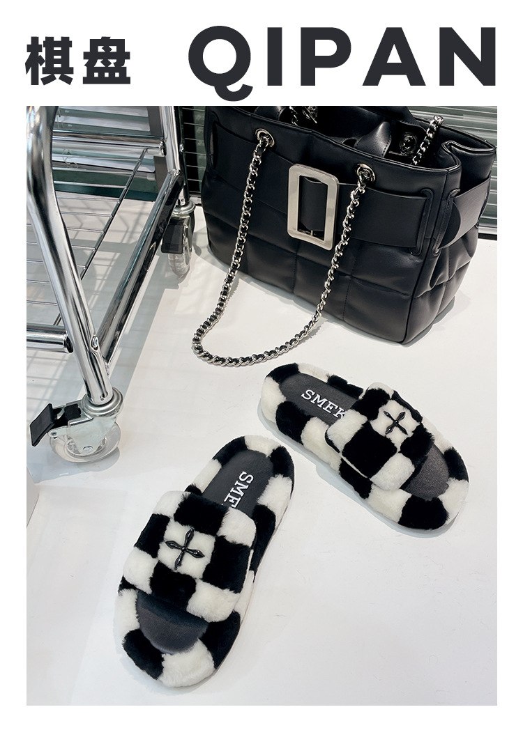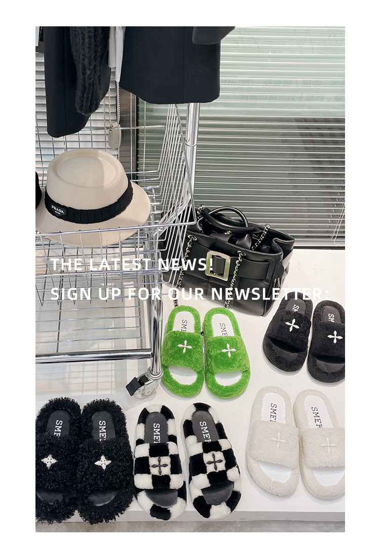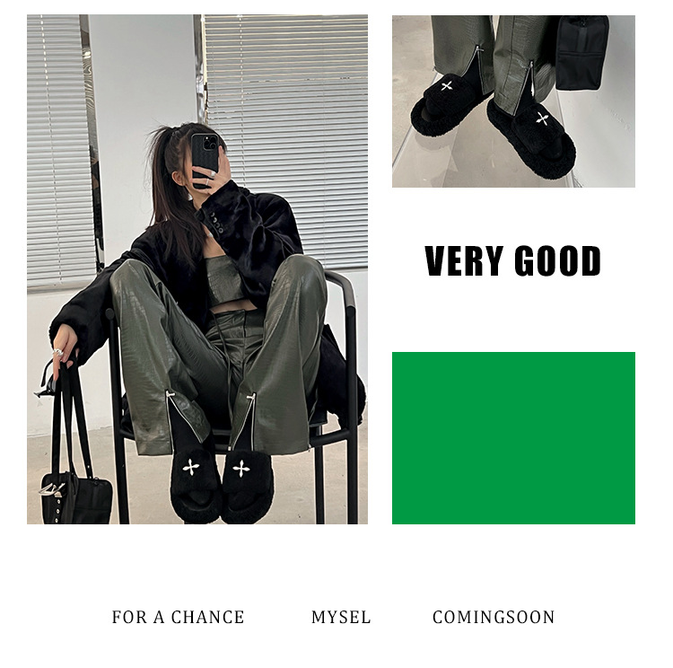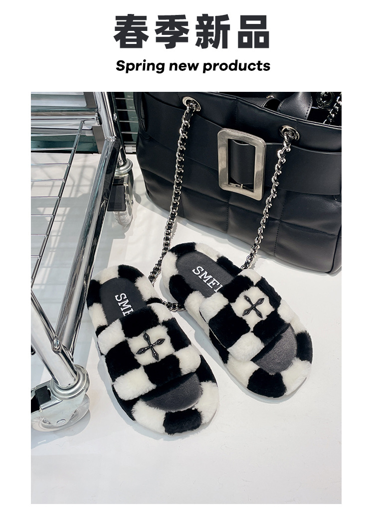 吴宣仪同款SMFK黑色毛毛拖鞋外穿十字花羊羔毛一字拖厚底毛毛拖鞋