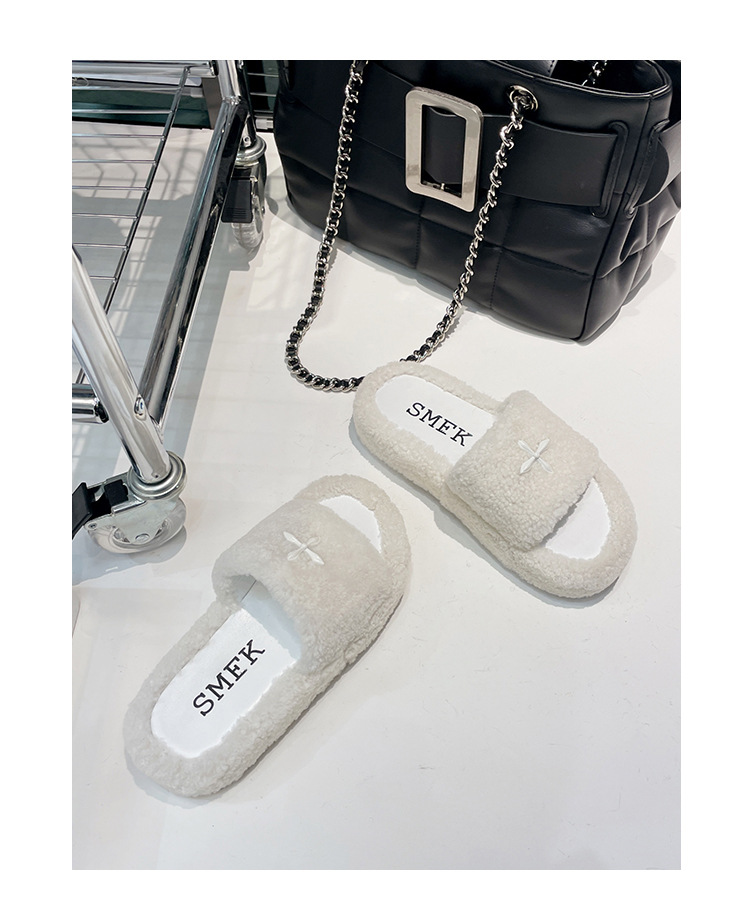 纯原SMFK轻奢风十字徽章毛鞋女秋冬外穿皮拖洋气厚底露趾休闲拖鞋