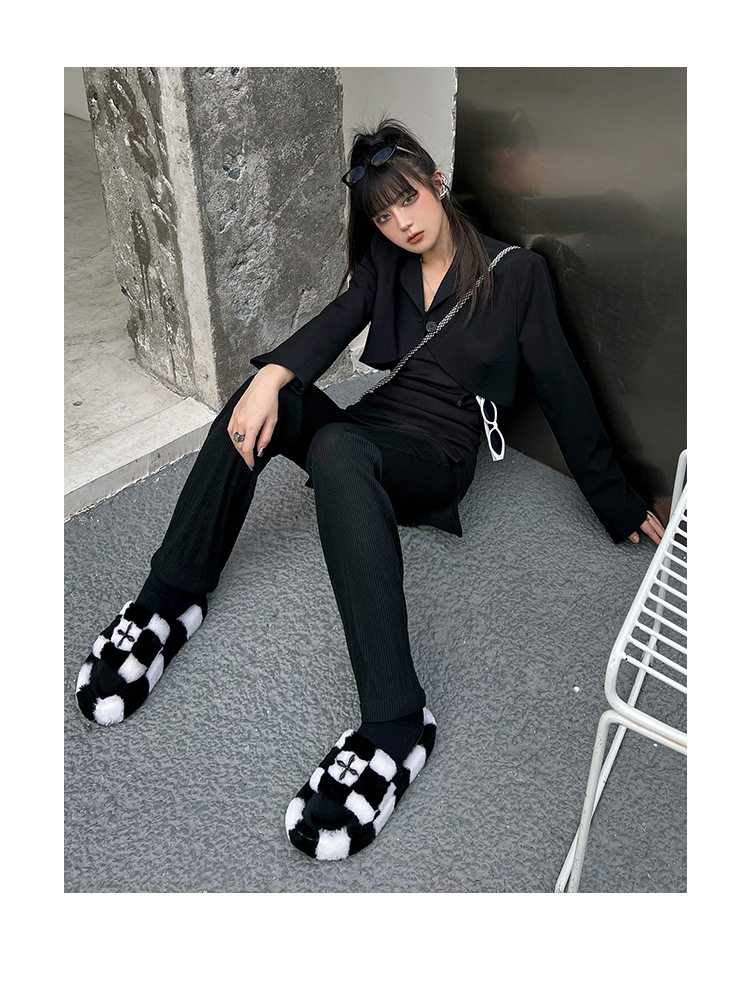 高バージョン ~ 潮牌X SMFK黒糸絨毛スリッパ女性は十字花の子羊の毛の厚い底を着ています。