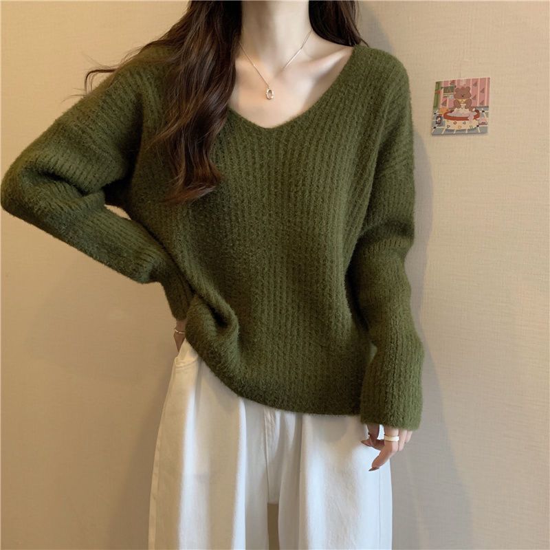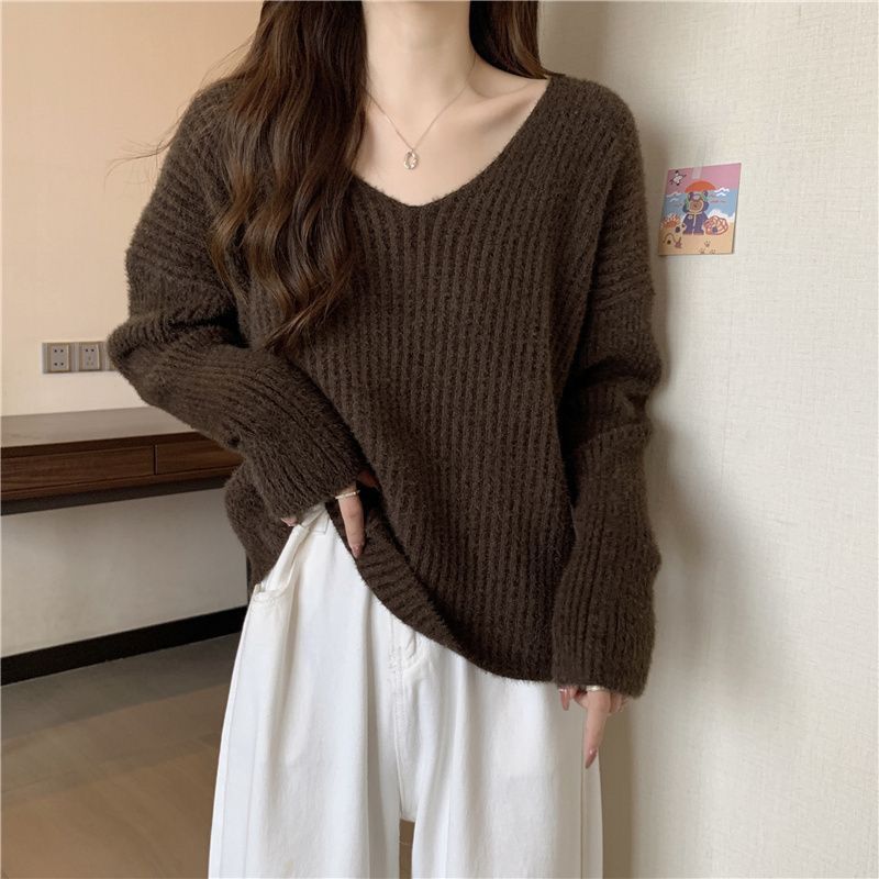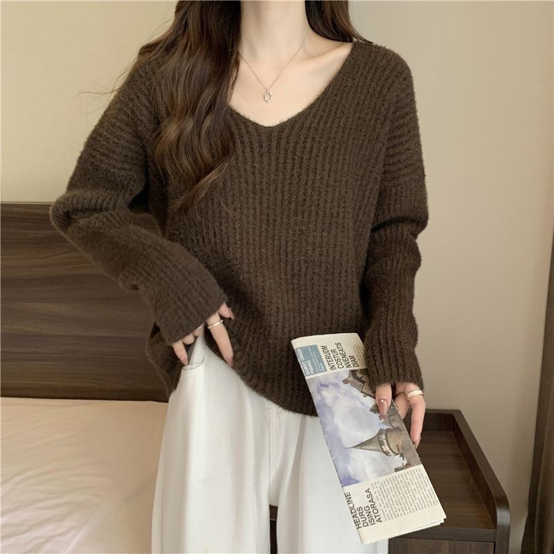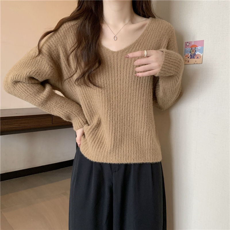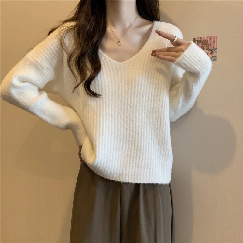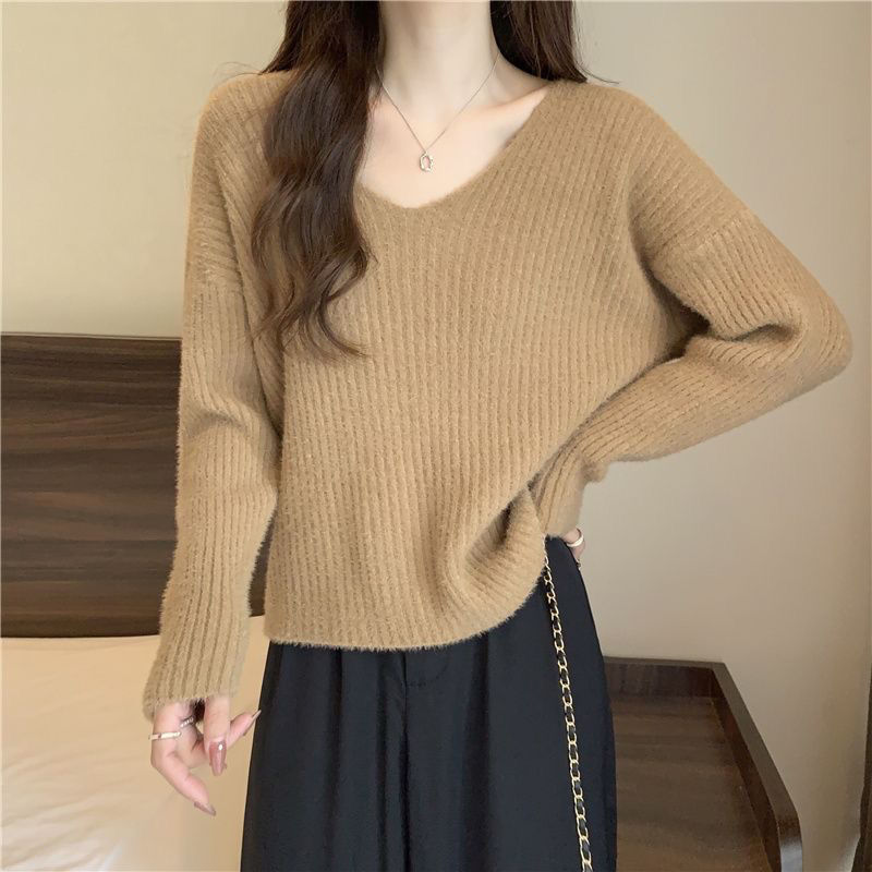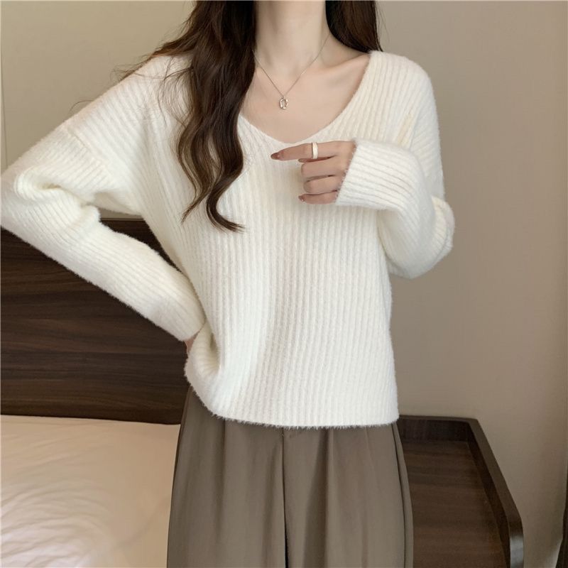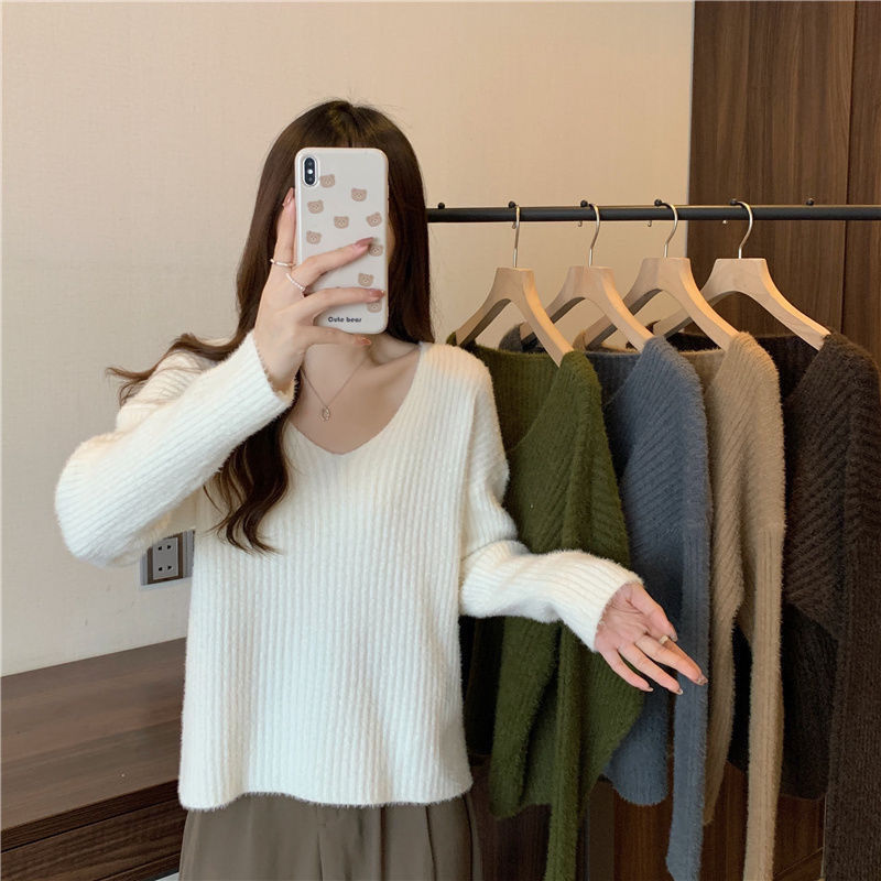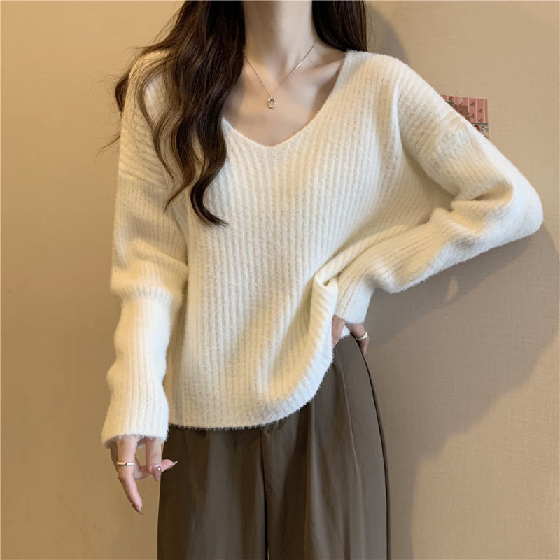ミルクのモチモチの風はミンクの毛のvネックのセーターの女性の秋冬の古着をまねてゆったりしています。