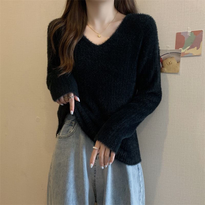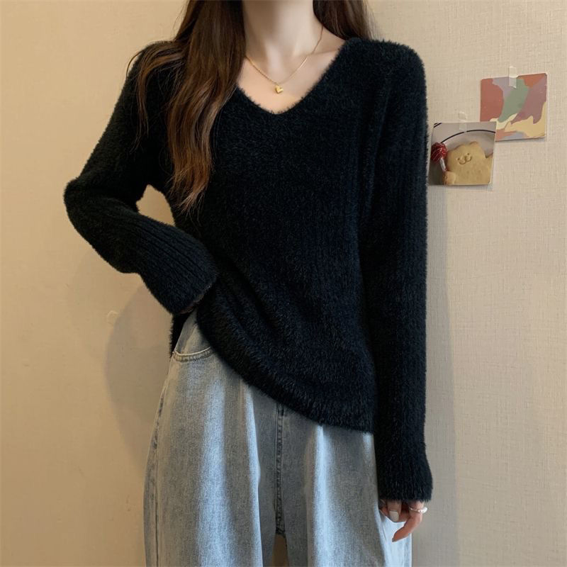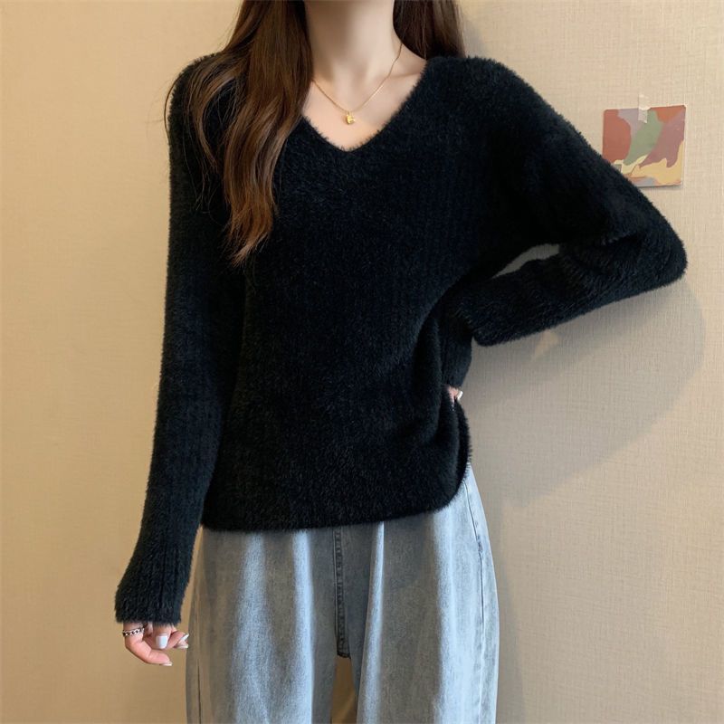 软糯水貂绒黑色毛衣女秋冬高级感超好看V领宽松内搭打底上衣加厚