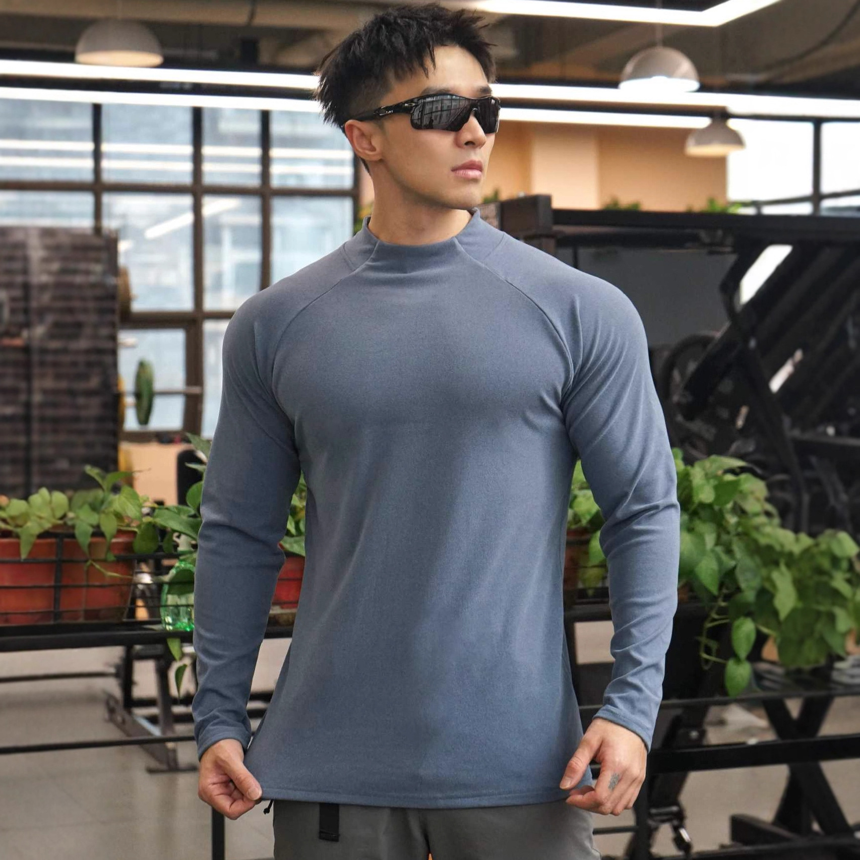 筋肉運動ゆるい綿質フィットネス長袖男性バスケットボール秋ランニングトレーニング水洗い綿運動tシャツ丸襟