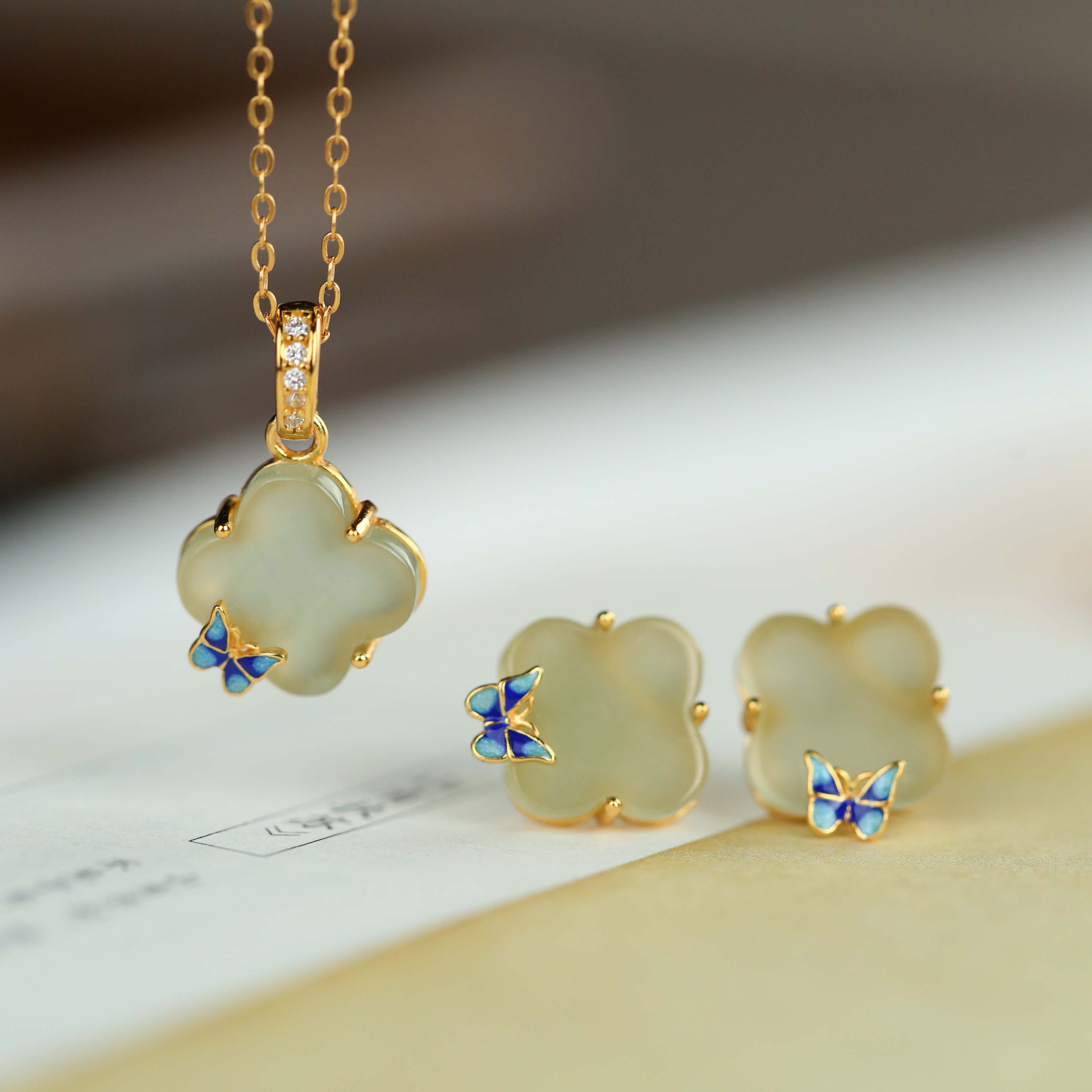 S925純銀は銀を象眼して青玉の四つ葉の草の蝶のイヤリングのペンダントの工芸の新しい中国式の優しい潮流の新型を嵌め込みます。