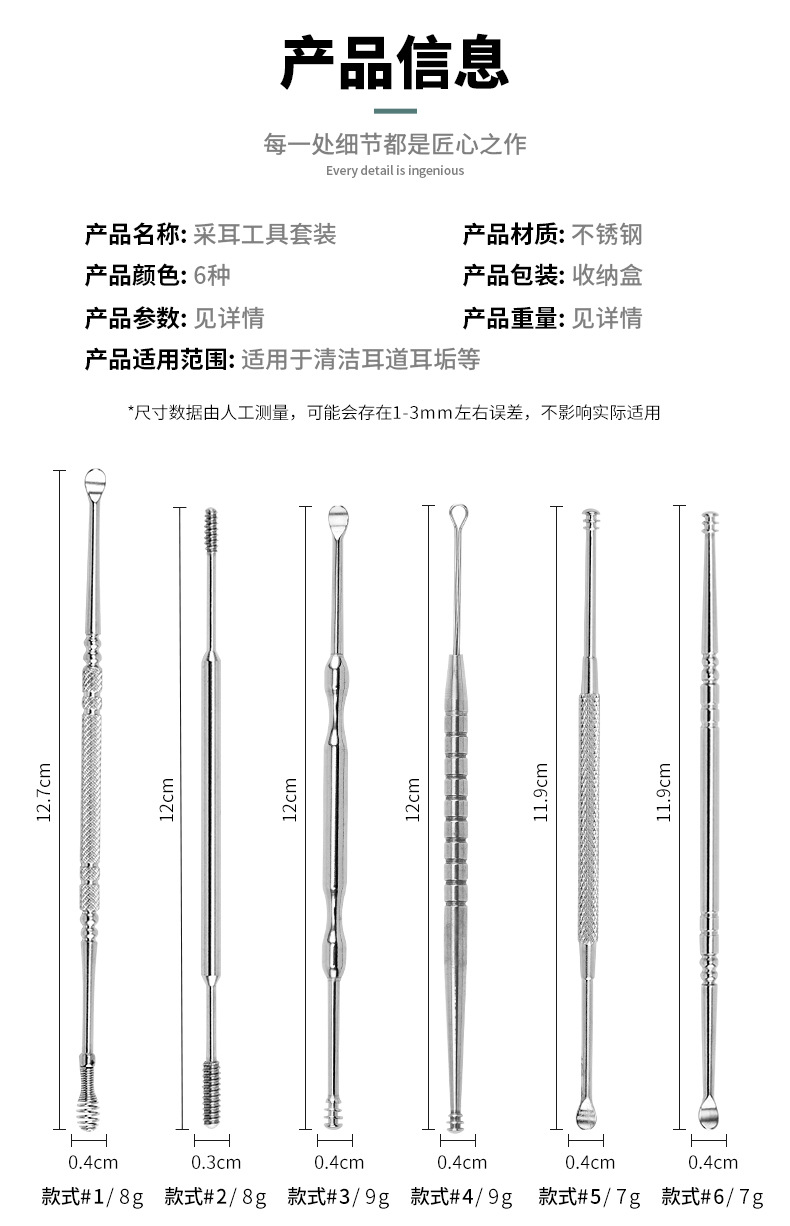 現物卸売りステンレス製耳かきスプーン6点セット家庭用耳かき道具美容店耳かきスプーンセット