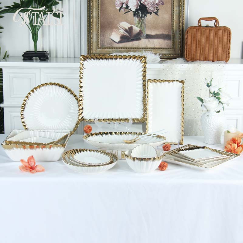 軽くて豪華な金辺の陶磁器の皿の魚の皿の食器の皿の食器のセットの洋食の皿の深い皿のスープの皿のステーキの家庭用の卸売り