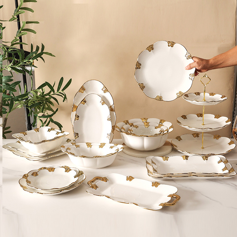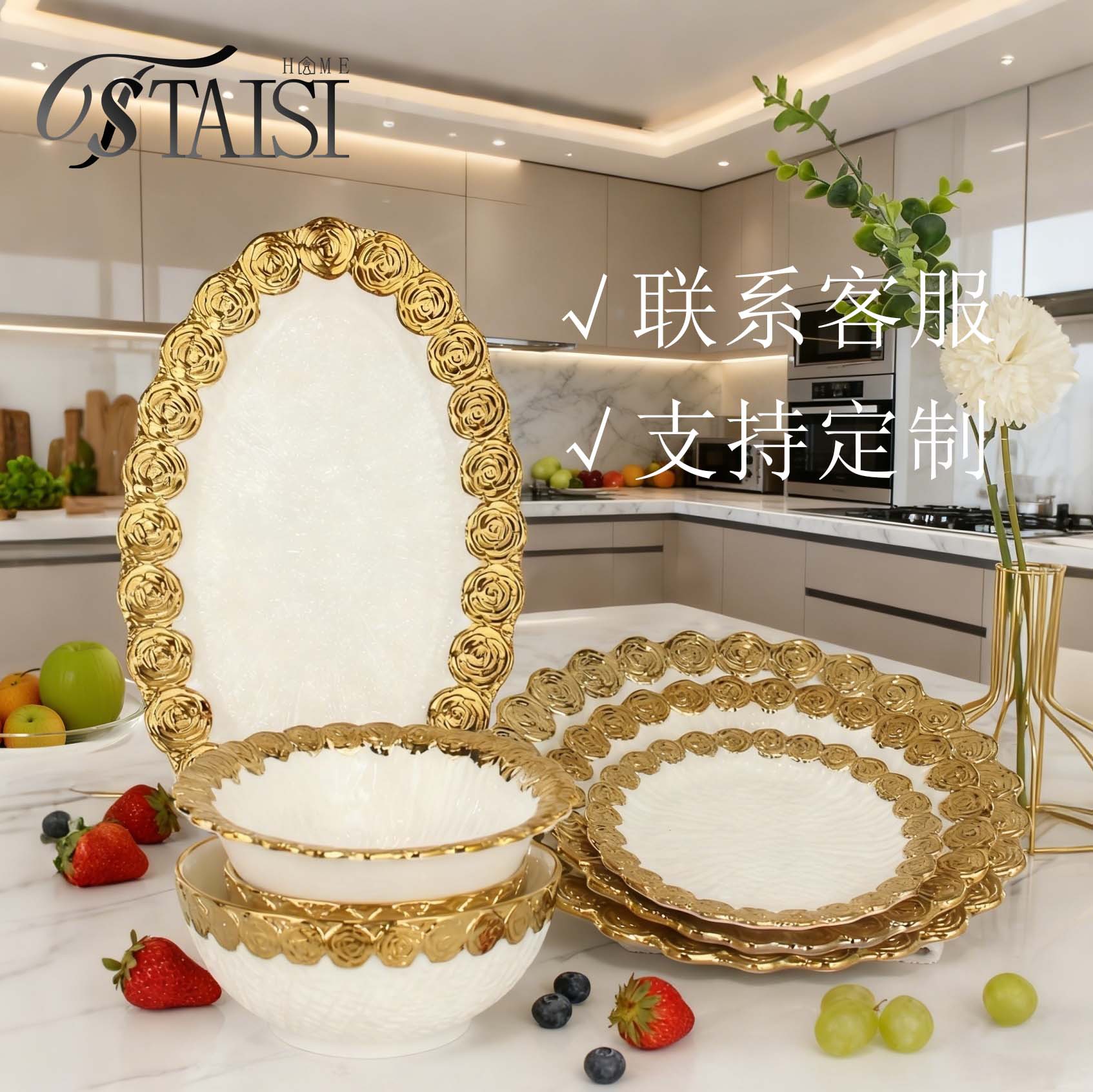 金辺薔薇贅沢食器皿ボウル家庭用セットセラミック食器レストランホテルサラダフルーツボウルステーキ皿