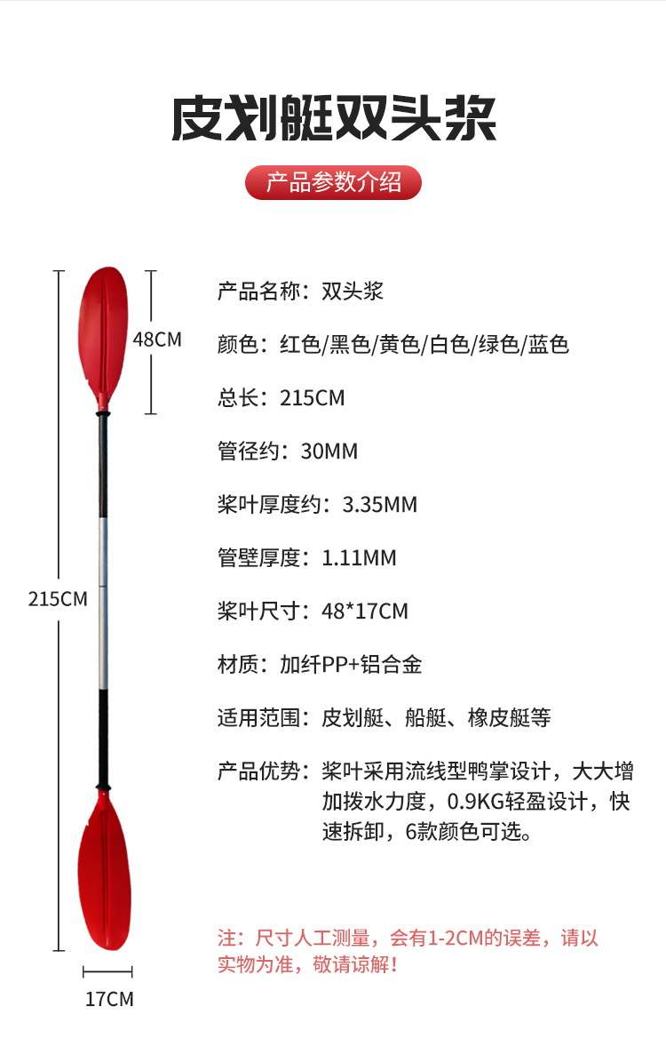 本双头桨可以拆卸为2节,发货时都是两节发出,到货后需要自己组合成一支桨使用,如果是做跨境需要看清具体尺寸长度,如果因为没有弄清楚尺寸直接拍下,导致无法发出,由此产生的运费由买家承担,请购买时看清楚,谢谢配合!!