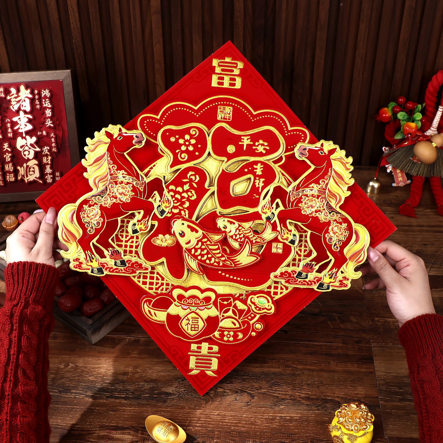 2026年カーボン紙製立体福文字ドアステッカー、馬年新年飾り、春節大晦日ドアステッカー、年画、卸売対聯