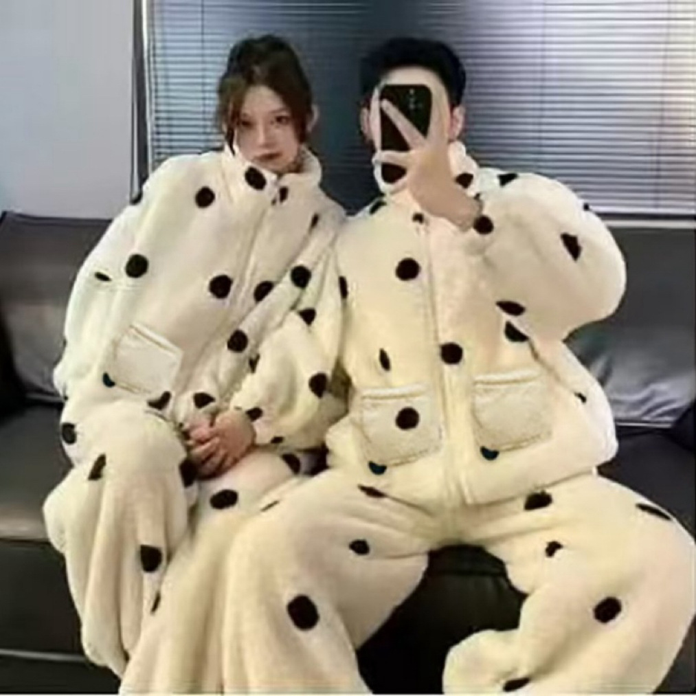 可爱波点情侣家居服秋冬季珊瑚绒加厚拉链高领家居服套装可外穿