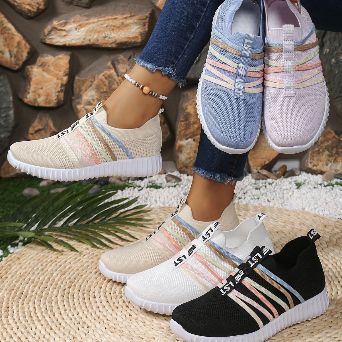 Temuママシューズ2025春の大人気フライニットシューズレインボーバンドシングルシューズカジュアルスリッポンシューズ越境卸売