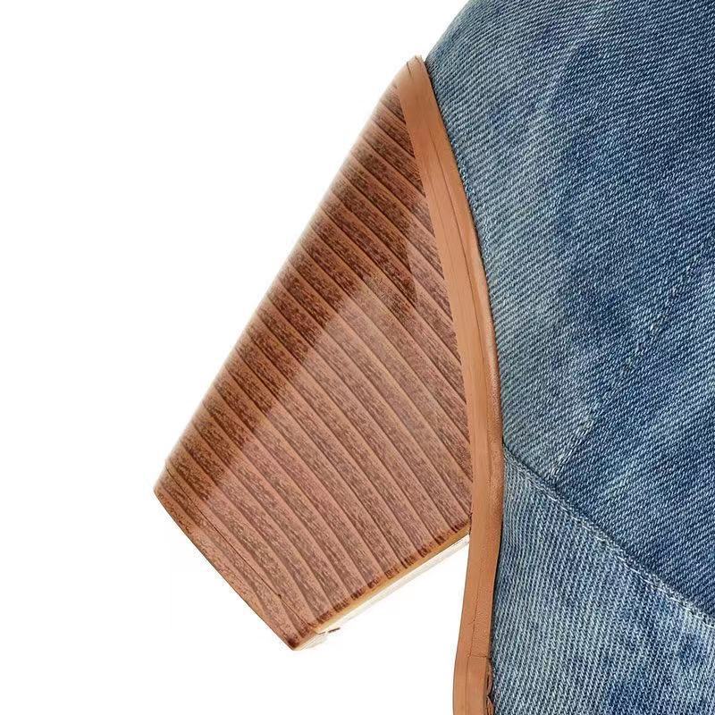 2023新型欧米大サイズの小衆開叉西部デニムの先の超ハイヒールの高筒が痩せているタバコのズボンの靴を見せます。