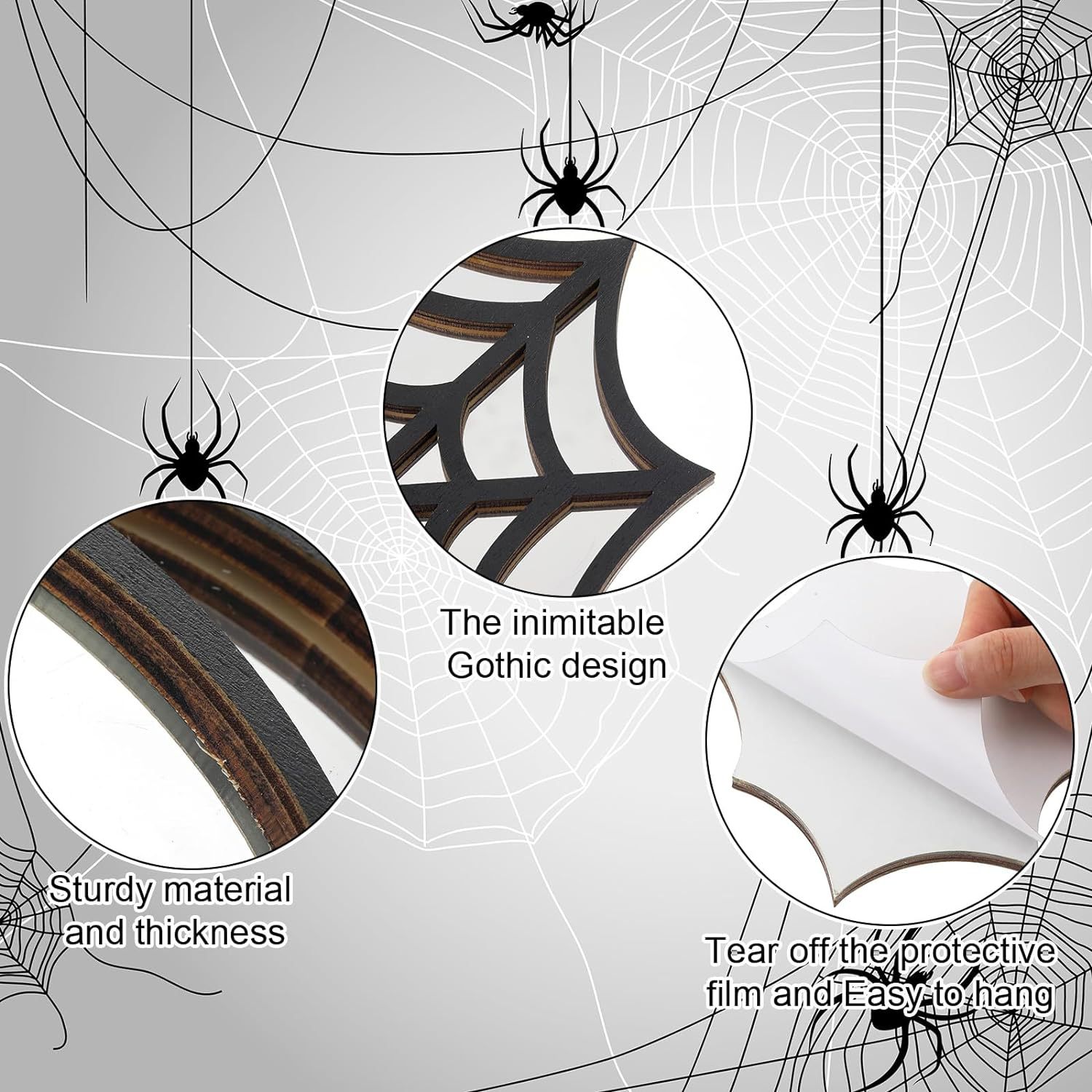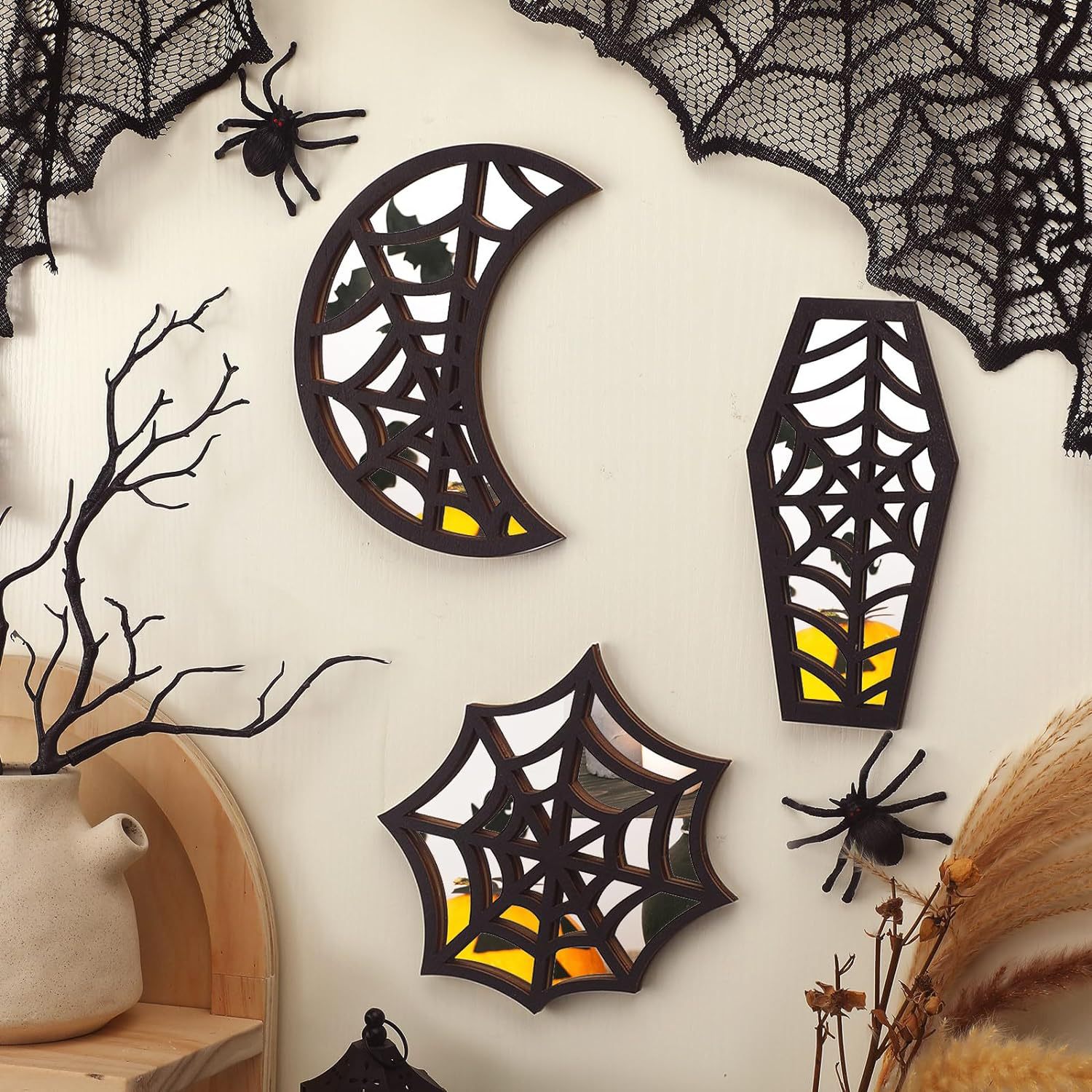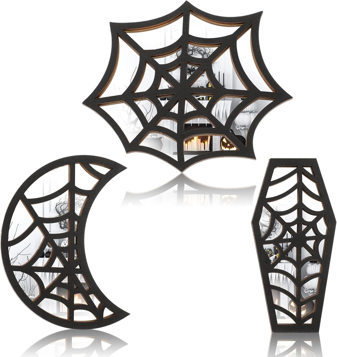 黒い木の棺と蜘蛛の巣と月の鏡は幽霊のゴシックを飾って鏡の田舎の壁を飾っている