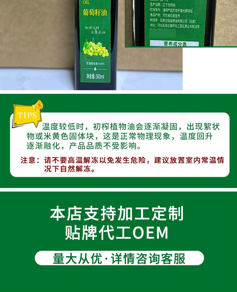 500ml圧搾ブドウ種子油、初搾り食用油、天然植物由来、非遺伝子組み換え、卸売供給