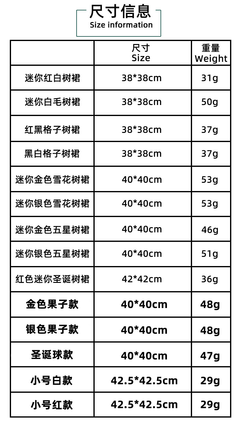 N2-18 ミニ紅白ツリースカート,N2-19 ミニ白髪ツリースカート,N2-20 赤黒チェック柄ツリースカート,N2-21 白黒チェック柄ツリースカート,N2-22 ミニゴールデンスノーフレークツリースカート,N2-23 ミニシルバースノーフレークツリースカート,N2-24 ミニゴールド五つ星ツリースカート,N2-25 ミニシルバー五つ星ツリースカート,N1-40 ブロンズ枝と葉のミニツリースカート,N1-41 シルバー箔押しリーフ ミニツリースカート,N1-42 クリスマスファン ミニツリースカート,N1-43 ホワイトミニツリースカート,N1-44 レッドミニツリースカート