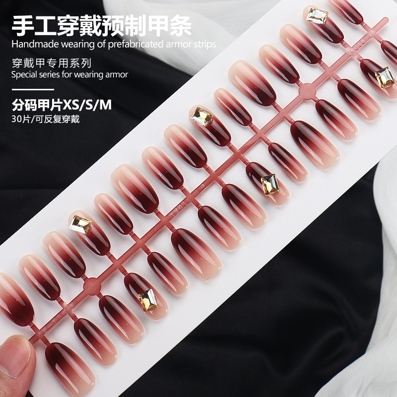 30片手工穿戴甲红棕渐变钻饰流行百搭不伤指甲可拆卸成品美甲甲片