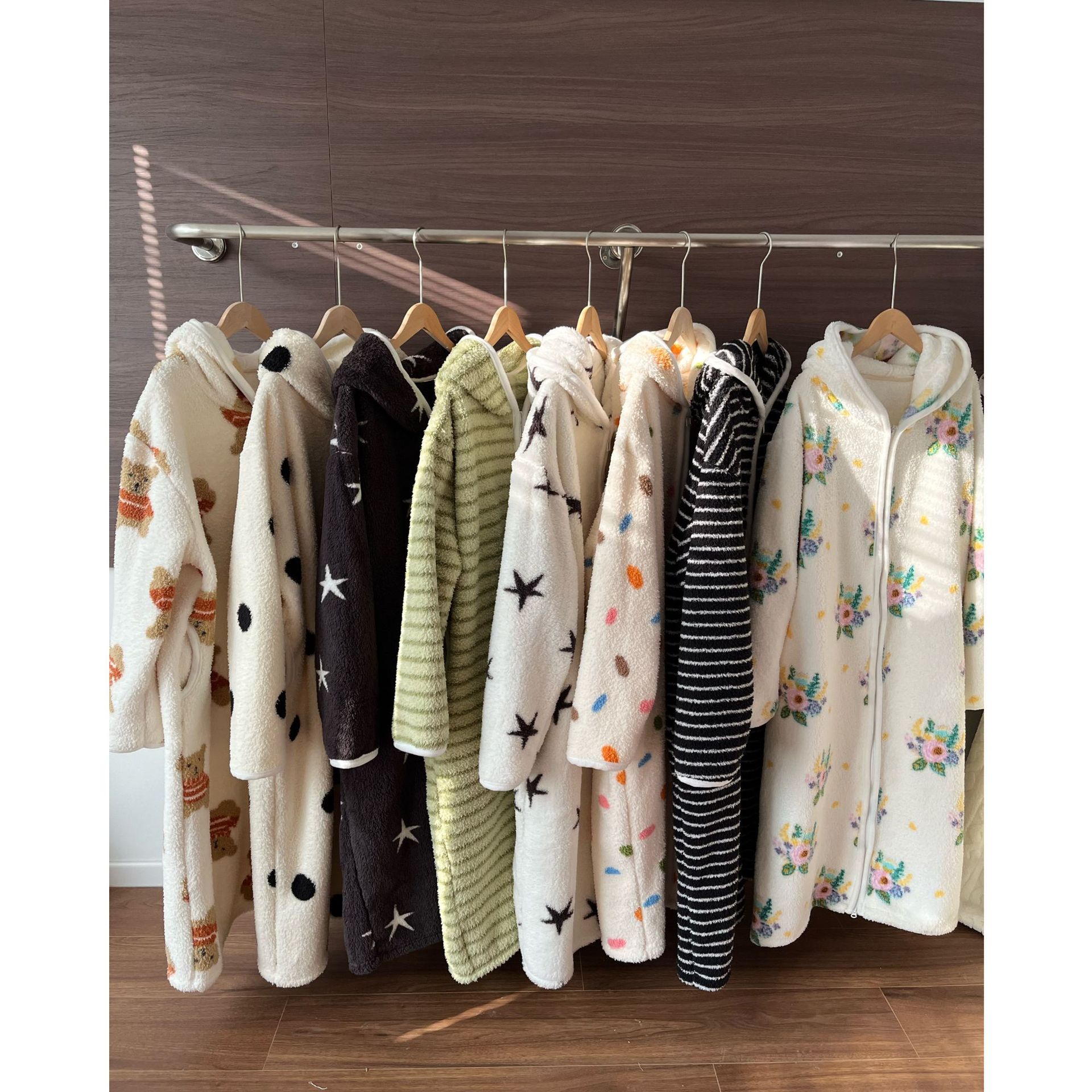 【实拍】秋冬季雪粒绒可爱碎花毛绒加厚家居服睡衣袍连帽拉链保暖