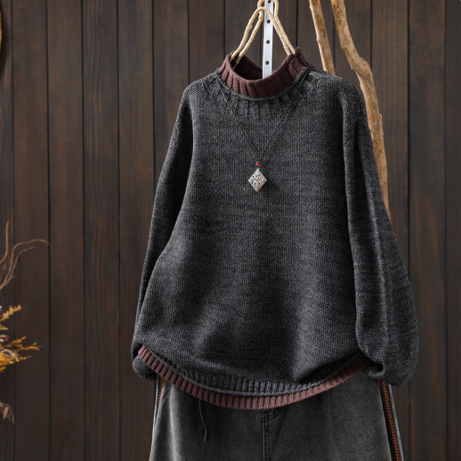 慵懒松弛感毛线衣女2025秋冬新款棉线撞色拼接半高领内搭宽松毛衣