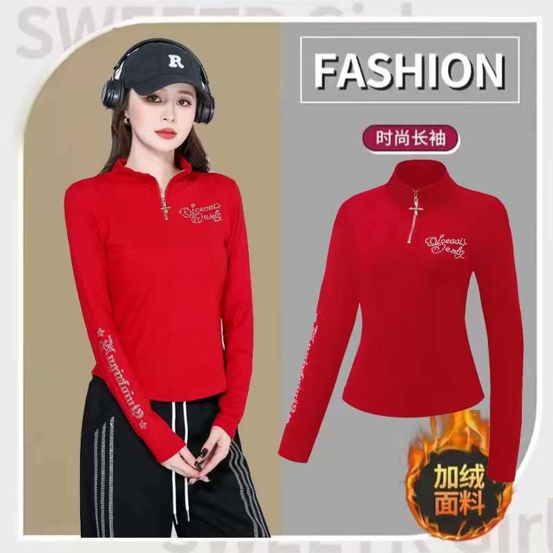 磨毛拉绒拉链翻领闪钻秋冬长袖高弹力T恤时尚烫钻韩版长袖