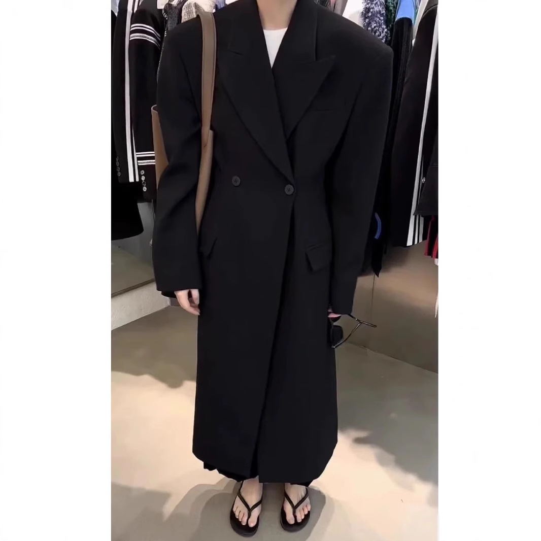 【予約】秋冬重工デザイン ウエストシェイプ ミニマリスト ワイドショルダー ブラック ロングコート スーツジャケット レディース