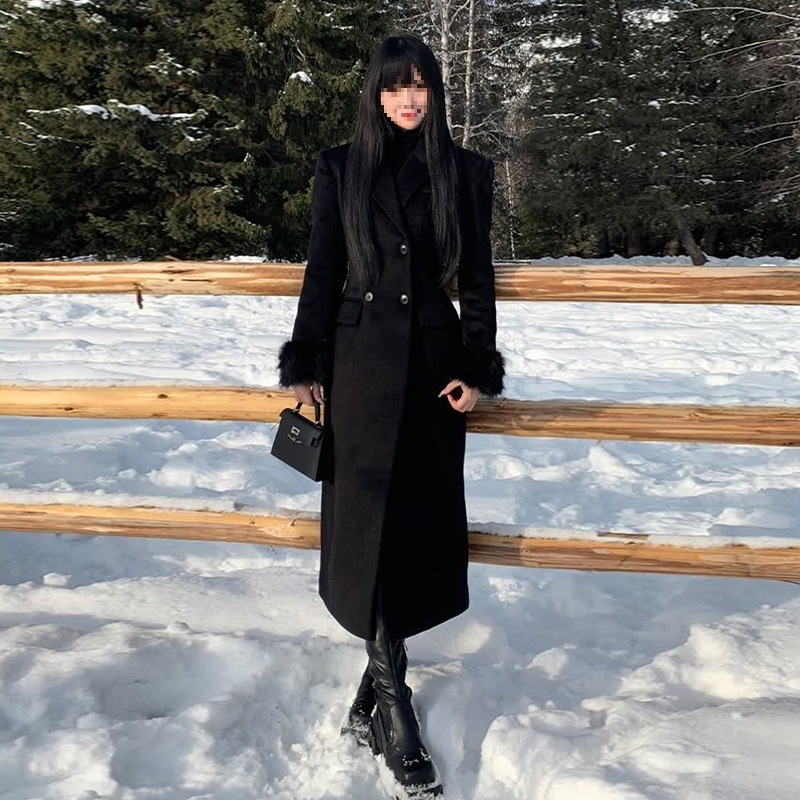 2025年冬 ミドル丈 ウエストシェイプ 取り外し可能なファー付きウールコート レディース ヘップバーン風 ブラック 細見えウールコート