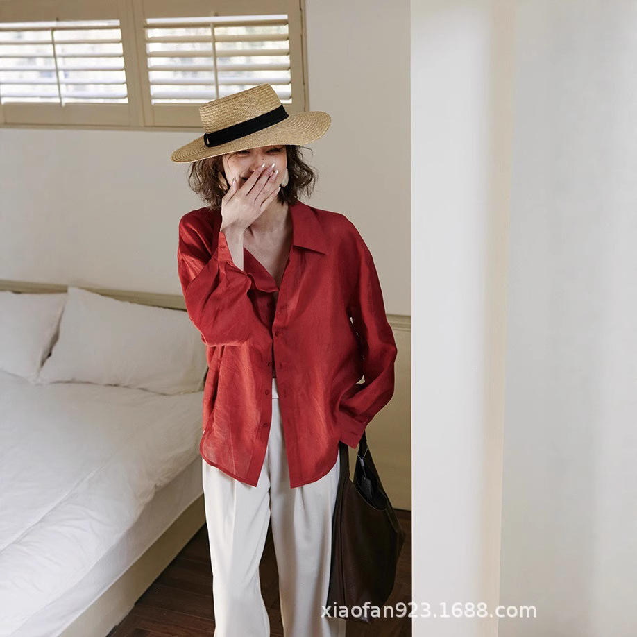 【在庫あり】夏のこの赤色を記録する インフルエンサーが通勤や休暇に着る赤色のジュンジュ麻長袖シャツ