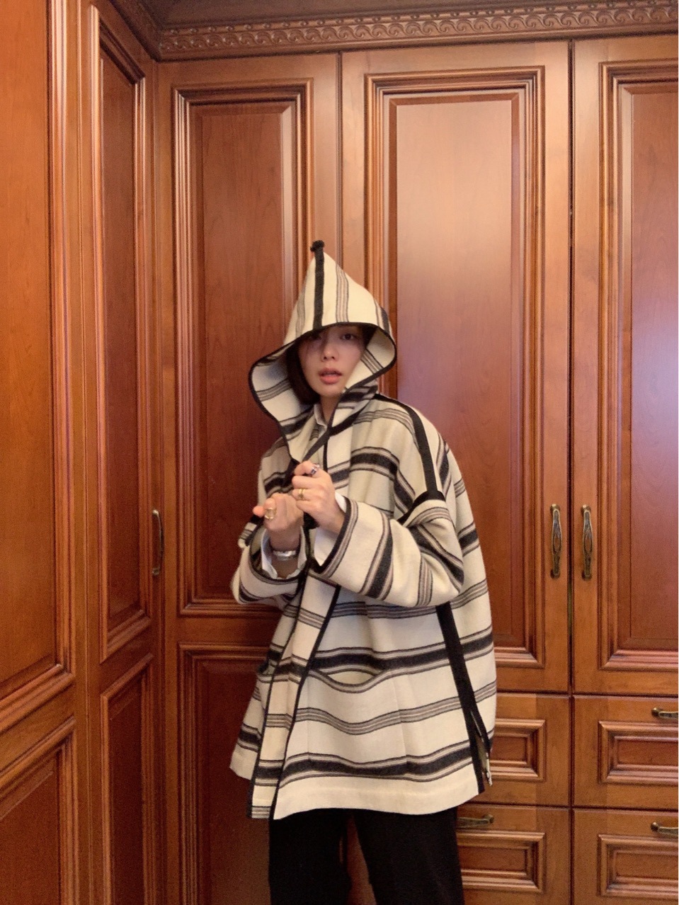 【受注生産】2024秋冬ストライプウール魔女風フリンジ付きフード付きコート ゆったりシルエットミドル丈