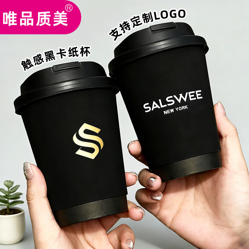 一次性咖啡黑色杯子拿铁美式热饮奶茶带盖绒面双层触感纸杯定 制