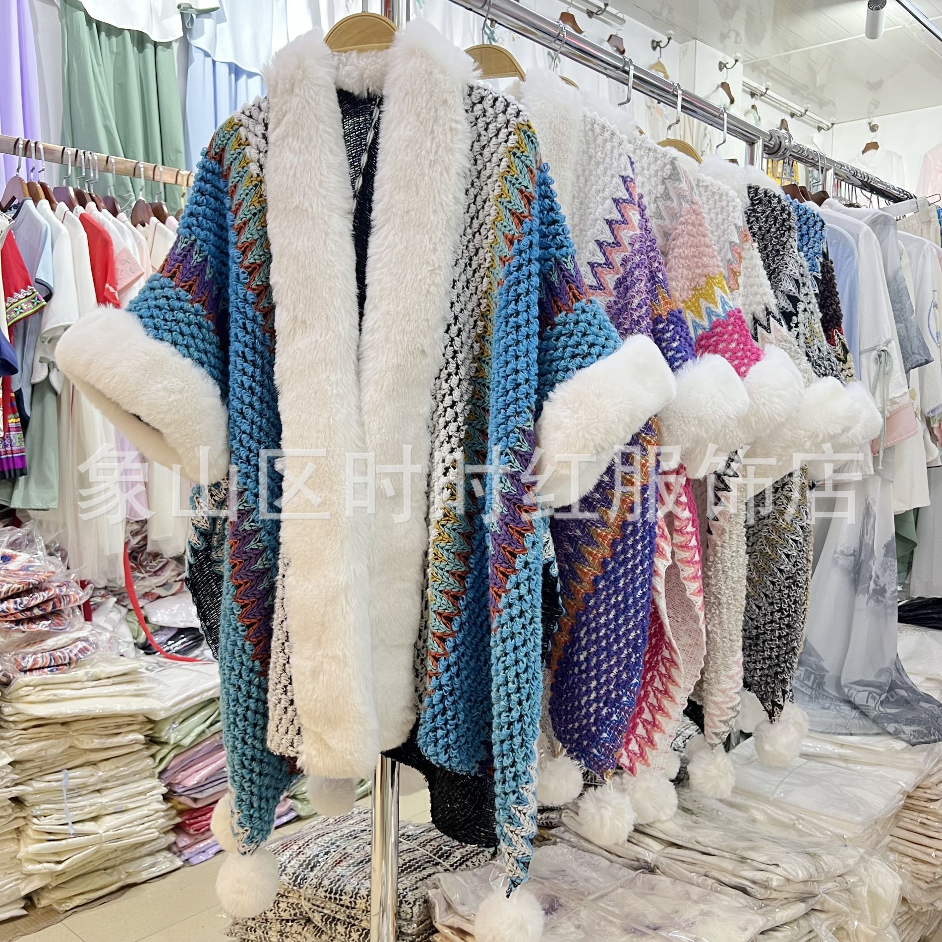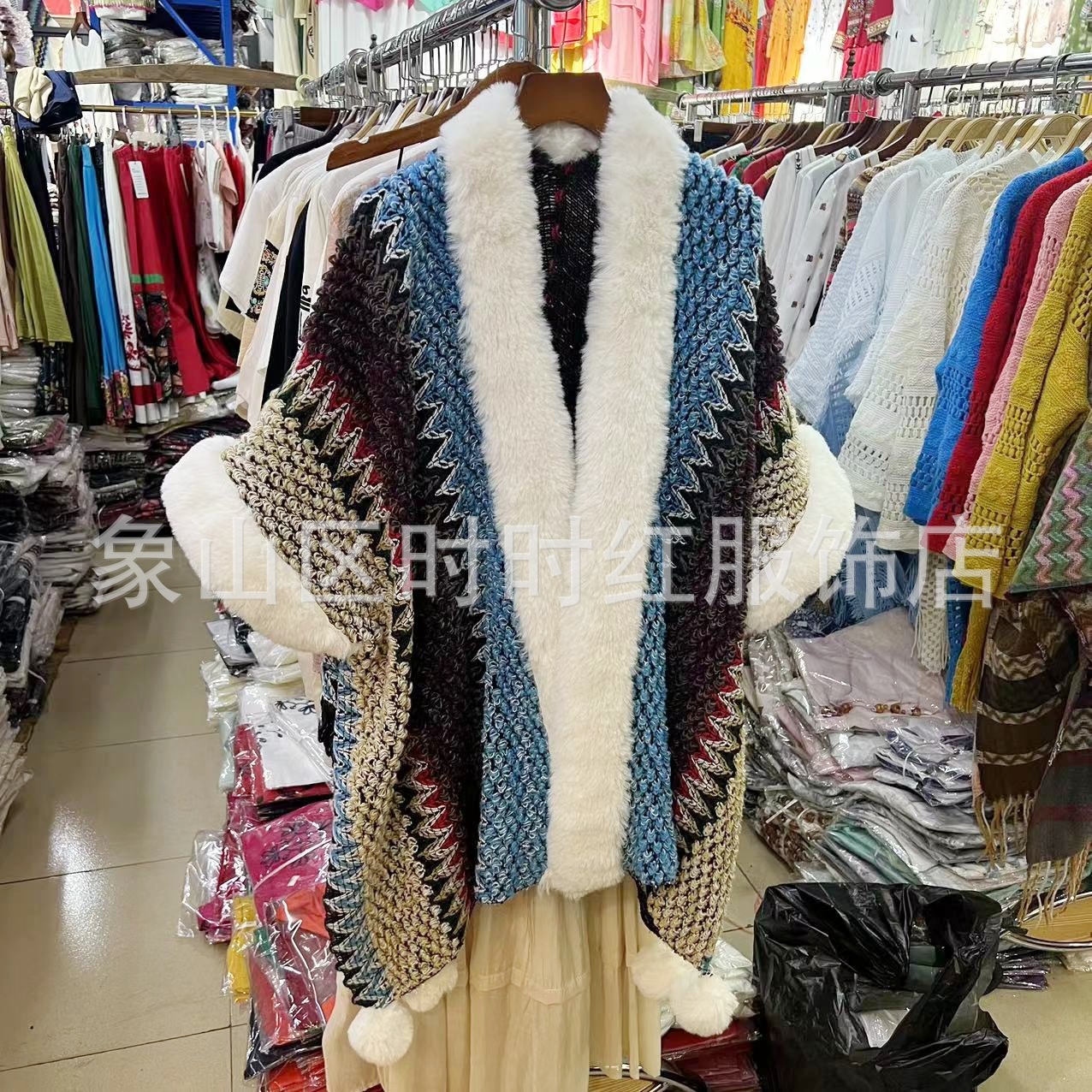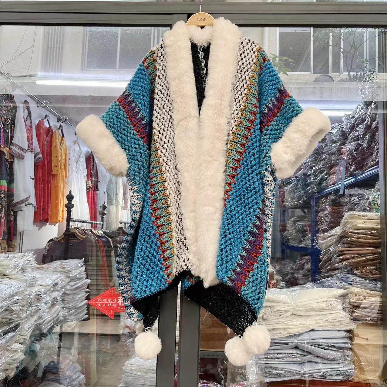 ウサギの毛のマントの秋冬の新型の民族の風のメリヤスのボールの毛の襟のオープンフォークのマントの旅行の保温の写真のマント