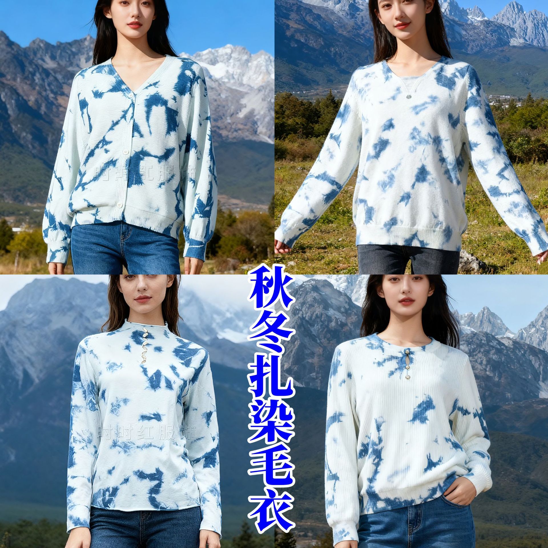 2025秋冬季云南贵州手工扎染毛衣开衫外套女长袖外搭针织短款上衣