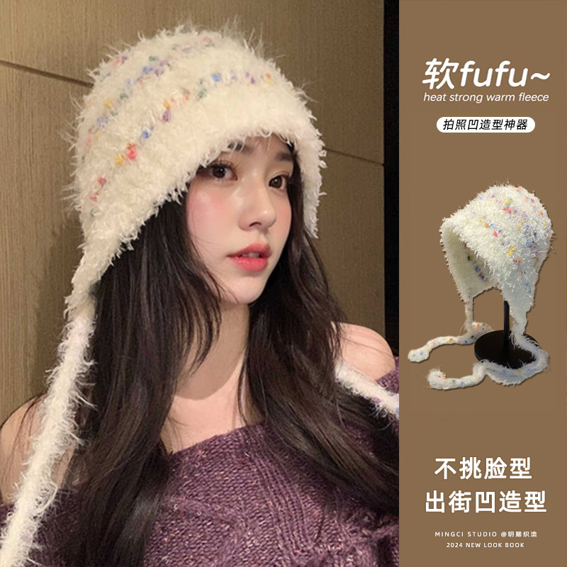 冬季拼色针织帽毛绒防寒帽大头围毛绒挂球可爱护耳帽子女遮耳加绒