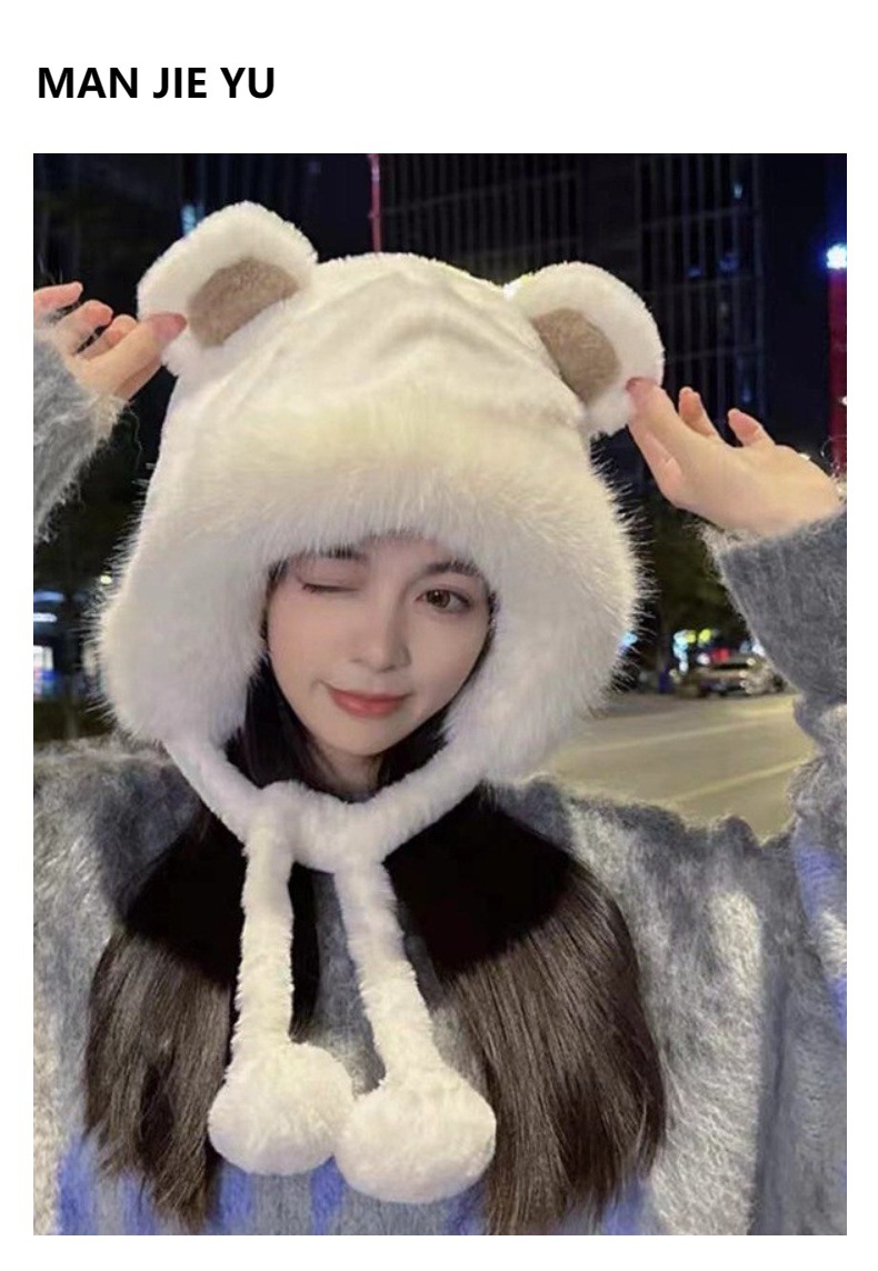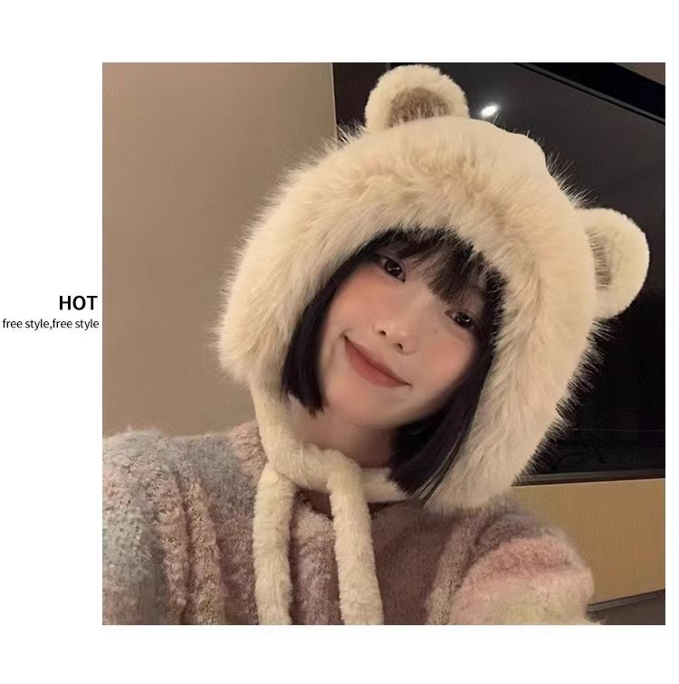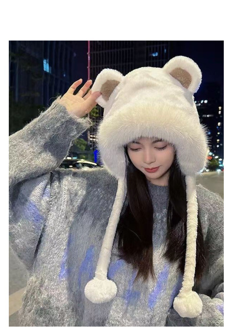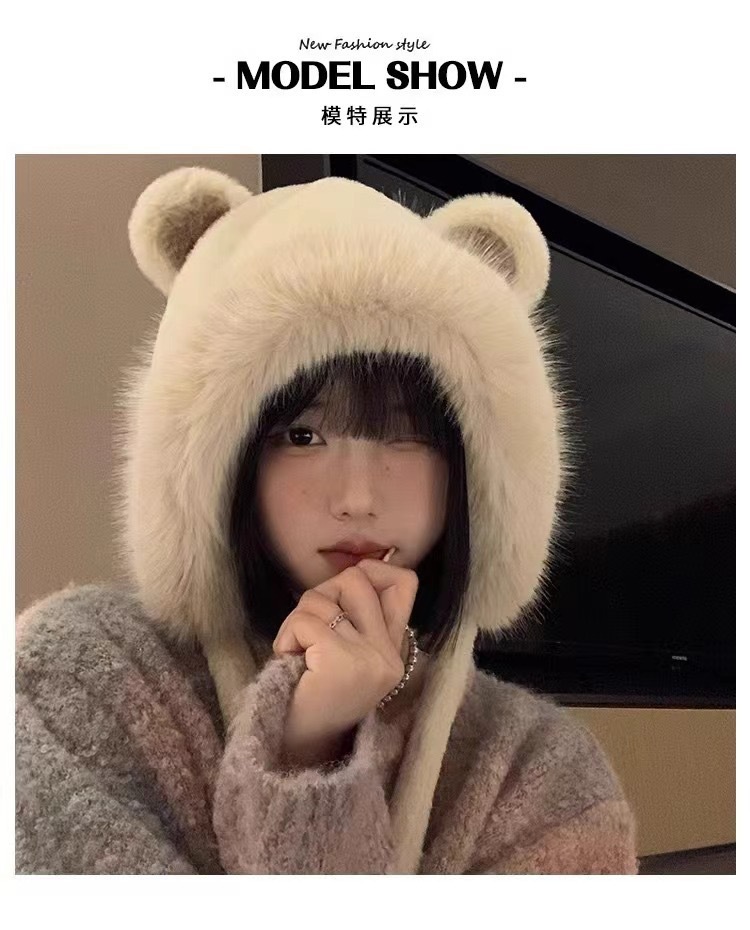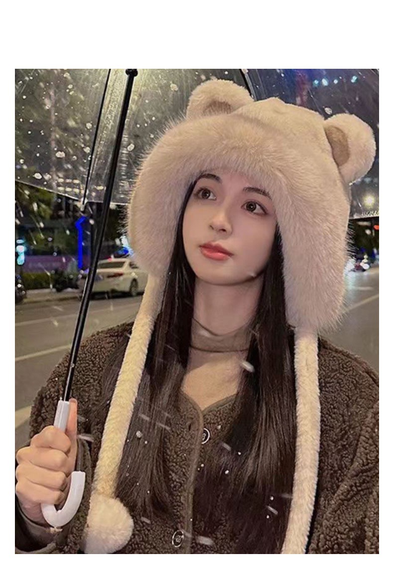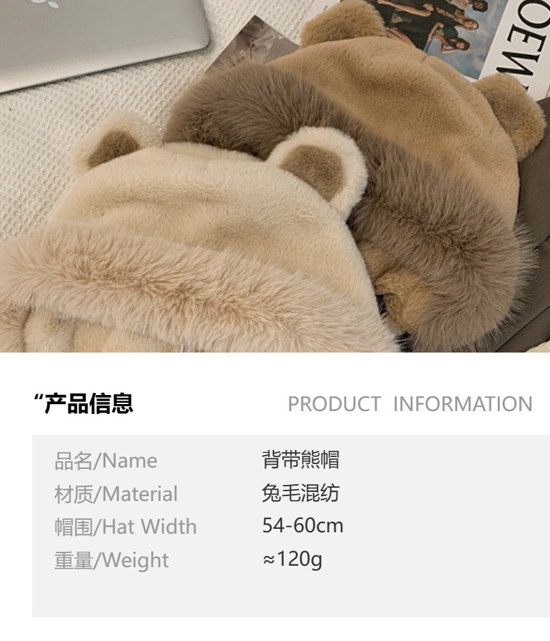 毛绒帽子新款百搭背带熊保暖雷锋帽可爱小熊女秋冬加厚加绒护耳帽