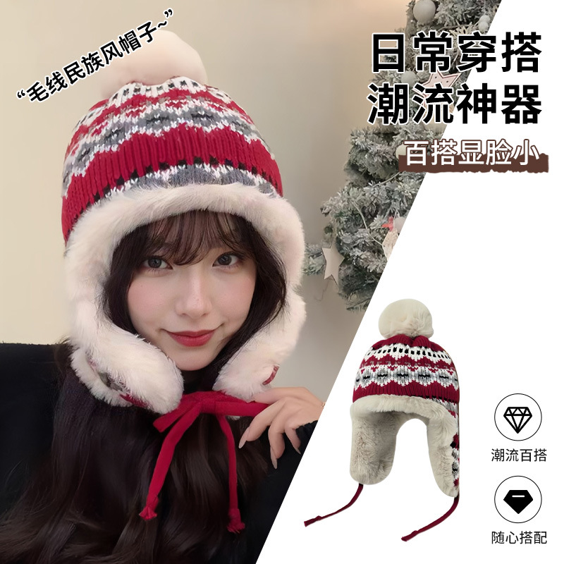 毛线民族风帽秋冬季女护耳毛绒包头套头帽骑车防风加绒保暖针织帽