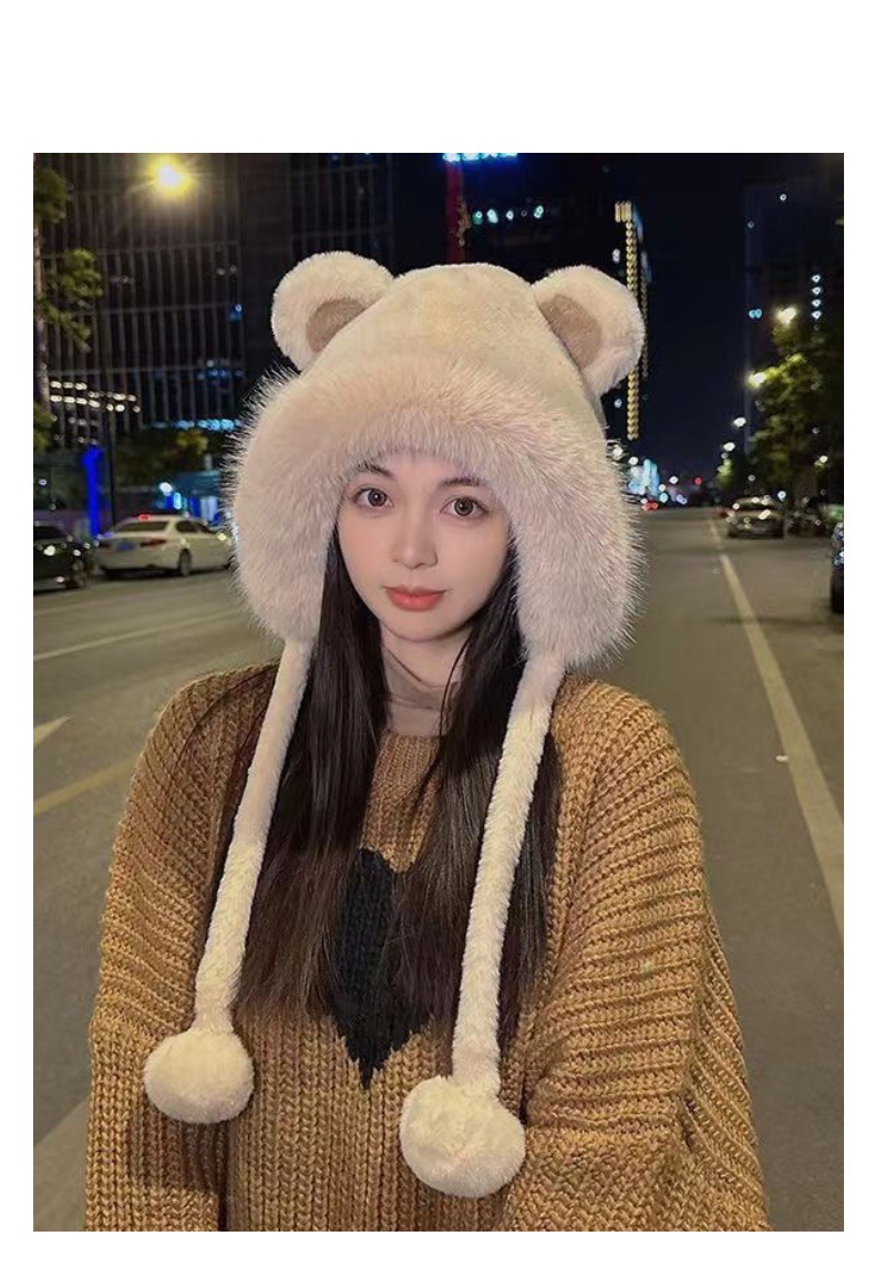冬かわいい毛皮のボールクマ耳ぬいぐるみ帽子女性のためのプラスベルベット暖かいプルオーバー帽子ファッション耳保護ストラップ帽子女性のための