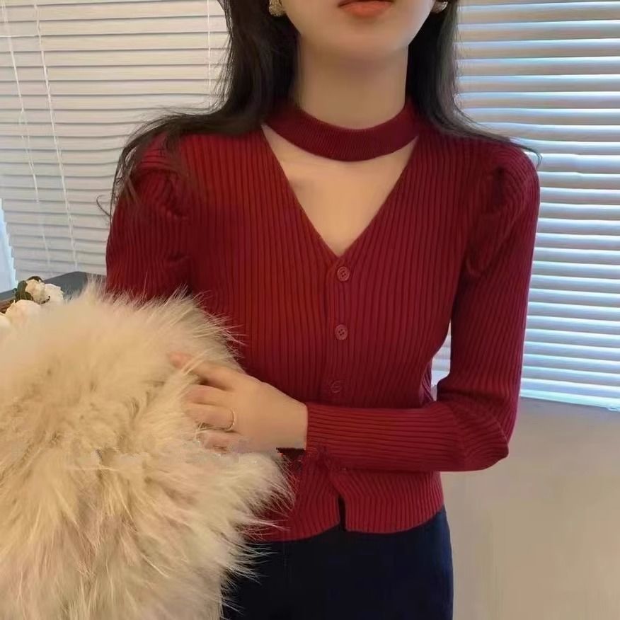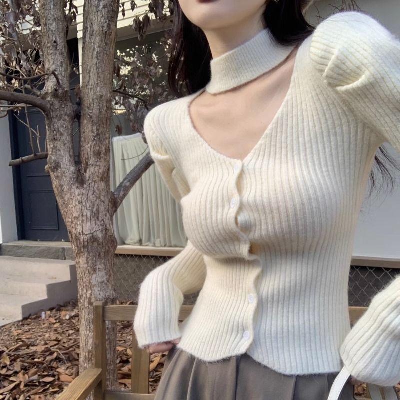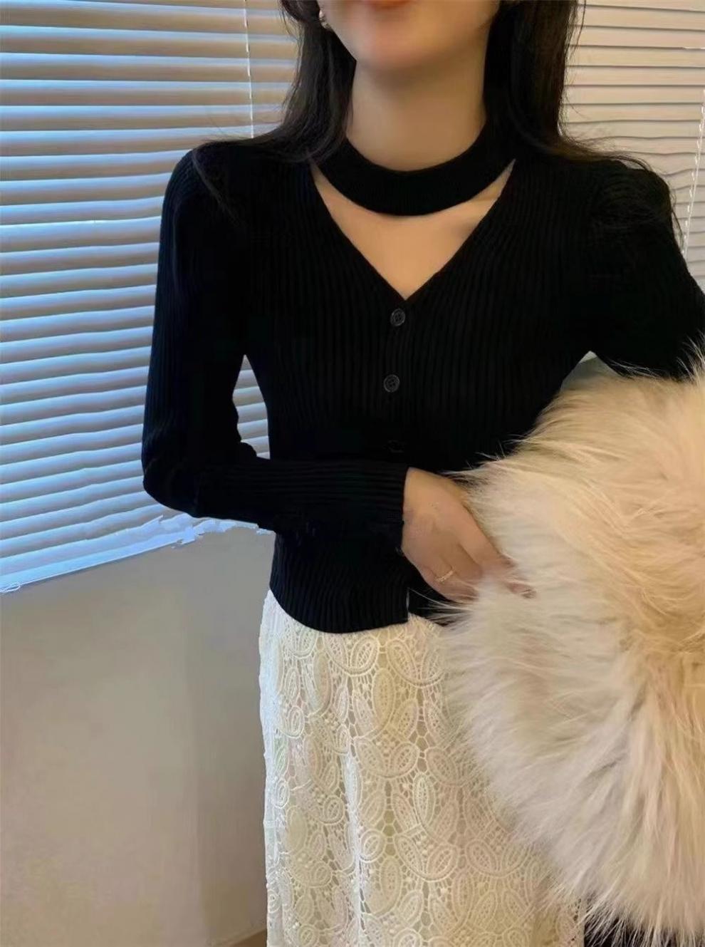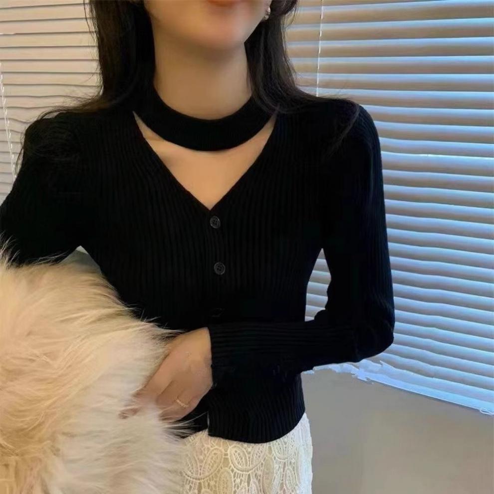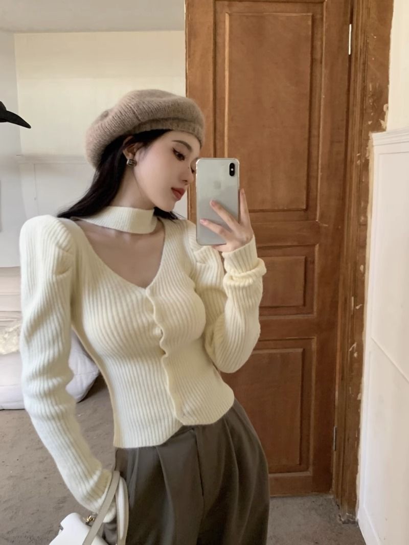 純粋な欲望風スリムフィットインナーセーター女性用52025秋冬新作高級感のあるホルターネックVネック長袖ニットセーター
