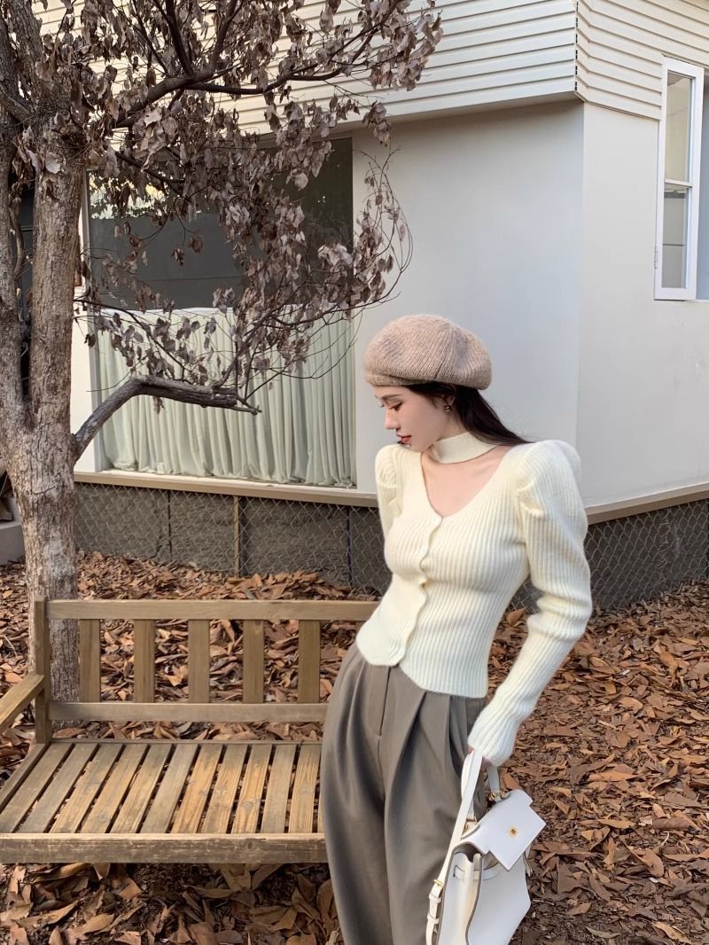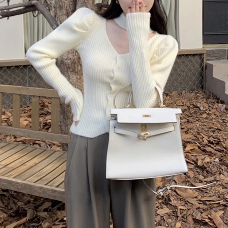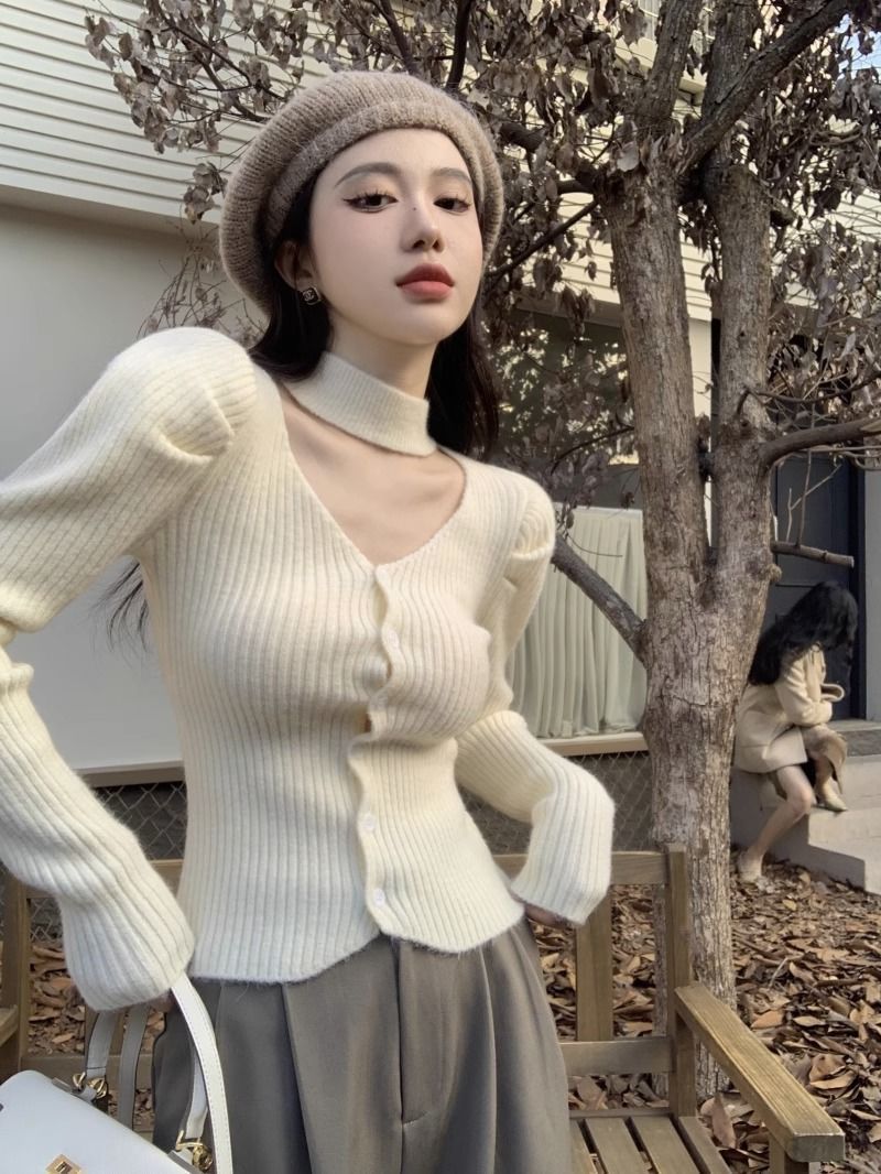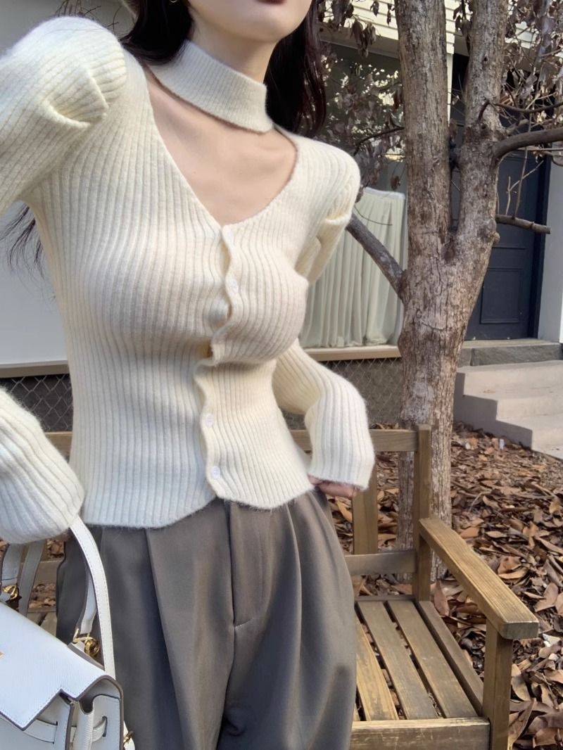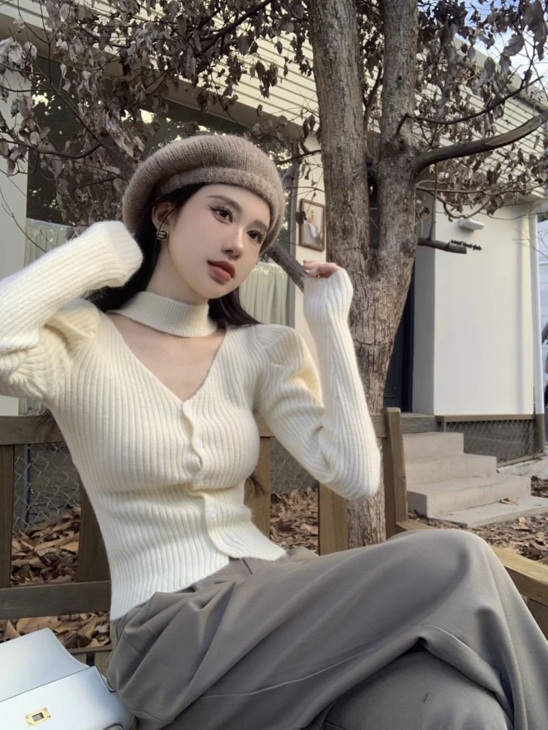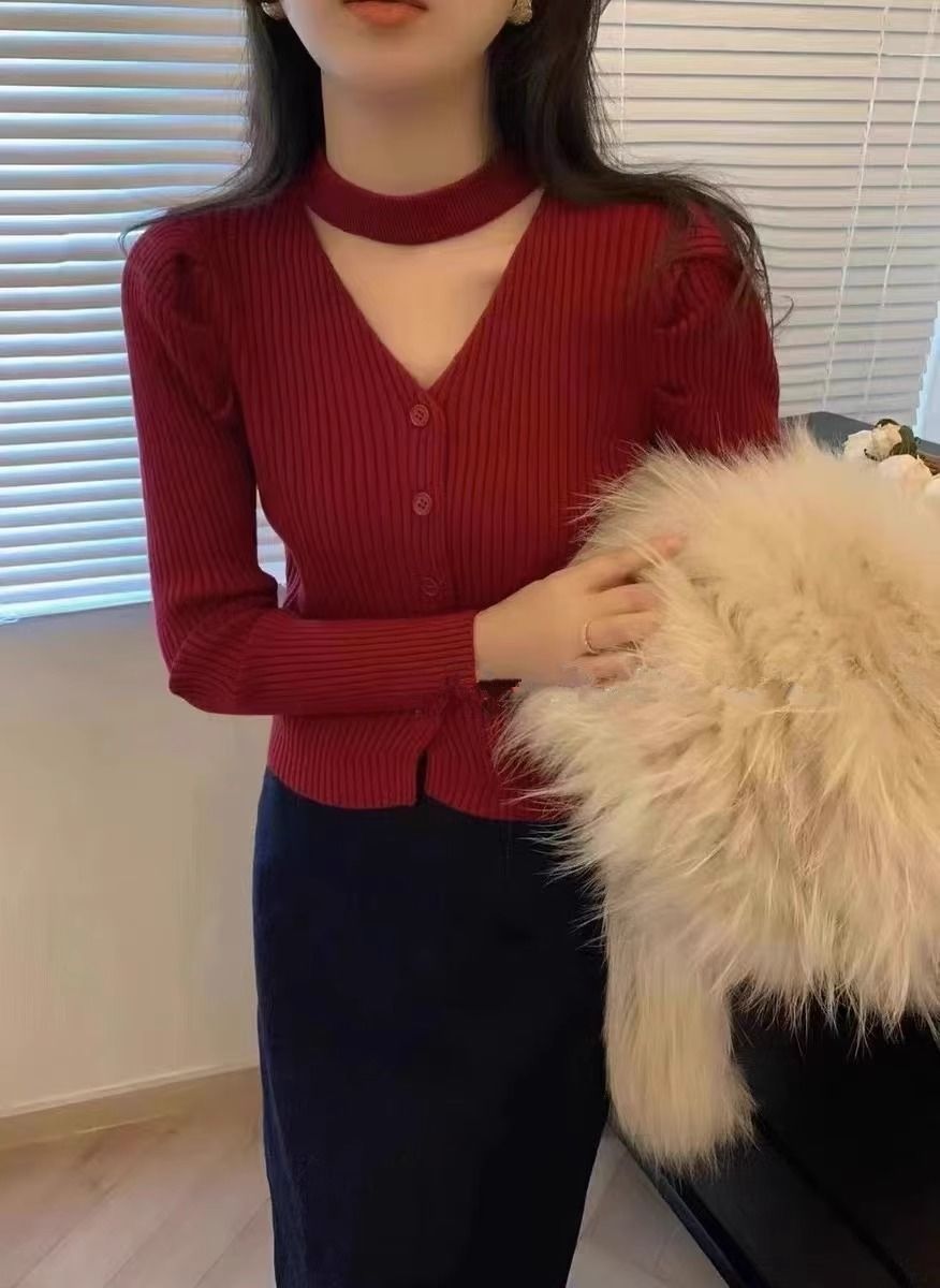 純粋な欲望風スリムフィットインナーセーター女性用52025秋冬新作高級感のあるホルターネックVネック長袖ニットセーター