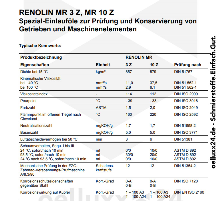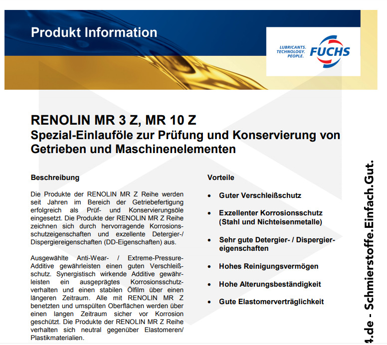 RENOLIN MR 3 Z, MR 10 Z用于测试和保存的特殊磨合油齿轮和机器元件PI 4-1056,第 1 页;下午 4 / 02.16