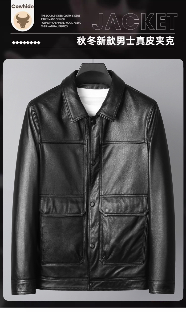 新作ビジネス用一層牛革ジャケット メンズ秋冬高級ラペル本革ショートレザージャケット 海寧レザージャケット