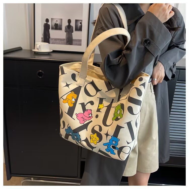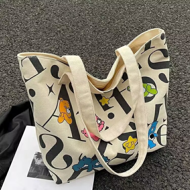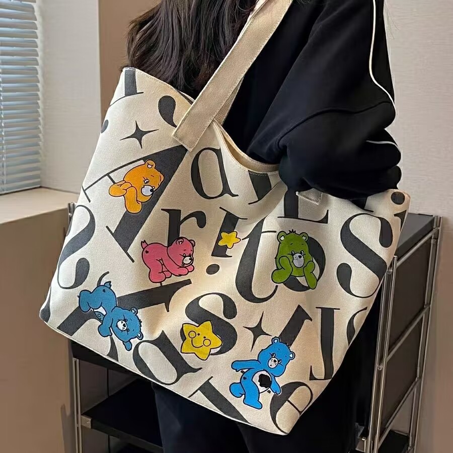 学生帆布包女大容量托特通勤包百搭印花妈咪包手提单肩包购物袋女