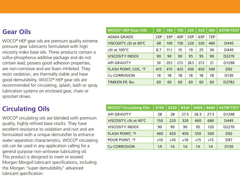 WOCO® circulating oils 循环油与优质质量、高度精炼的基础油。 他们有优异的抗氧化性和防锈性,并且配以独特的破乳剂,以增强水分离特性。 WOCO® 循环油可用于任何需要通用非抗磨润滑油。本产品旨在满足或超过Morgan Morgoil 润滑油规格,包括摩根“超强抗乳化性”好进润滑剂规格。