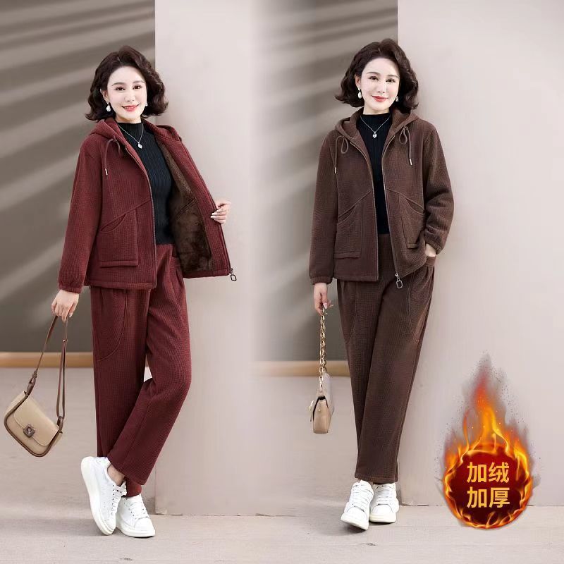 妈妈冬季加绒加厚运动套装新款洋气连帽外套中老年休闲两件套