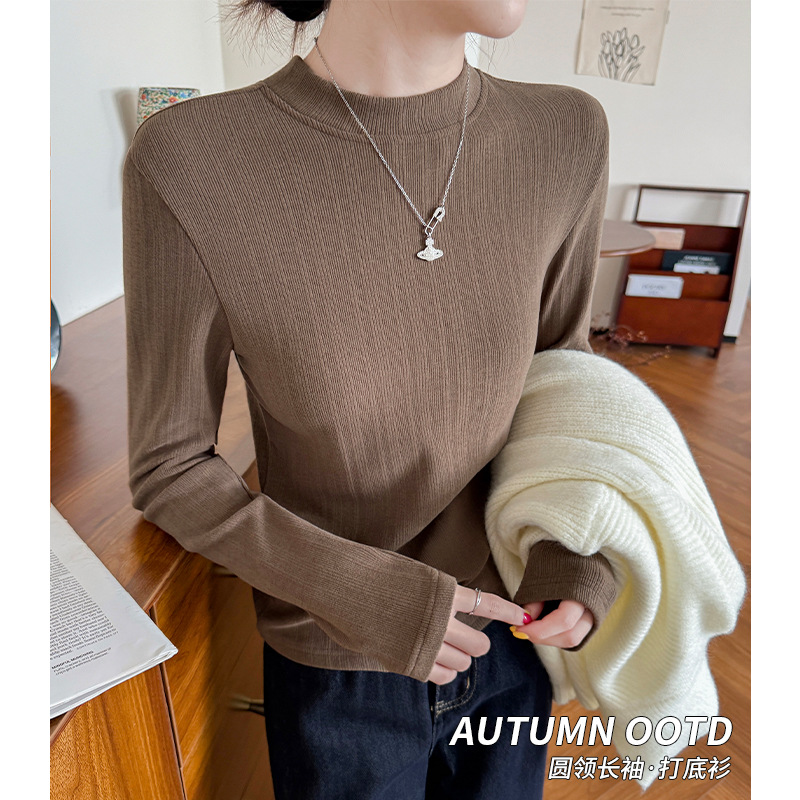 小圆领长袖打底衫女秋冬新款修身内搭高级感t恤显瘦洋气正肩上衣