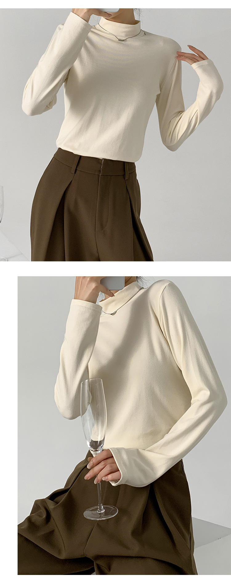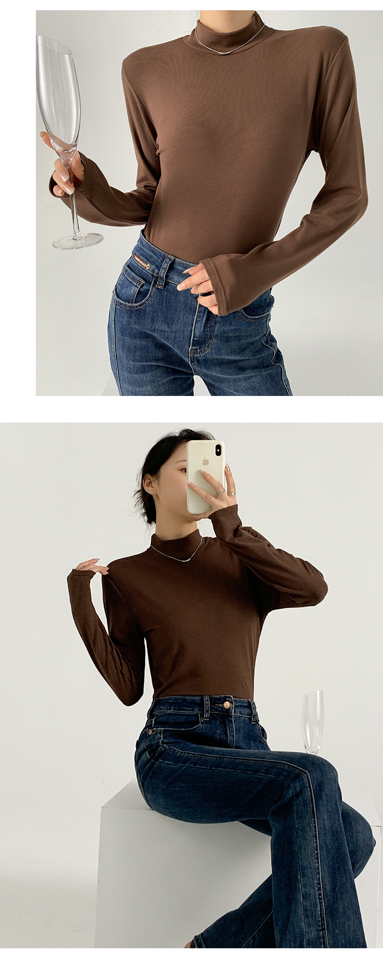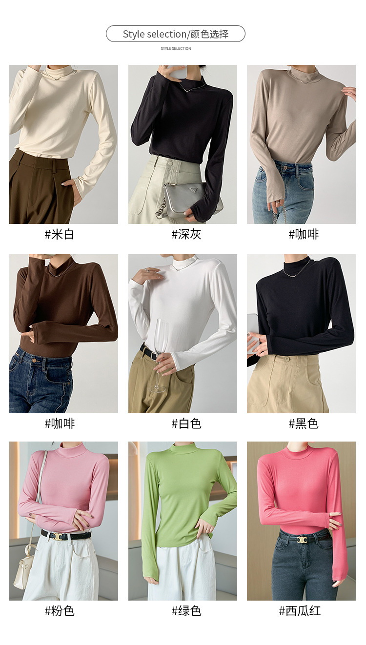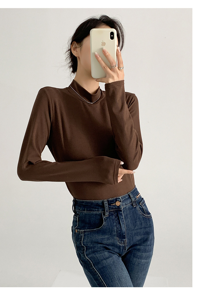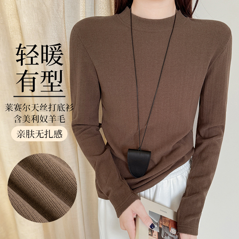 咖色半高领长袖打底衫女秋冬新款内搭显瘦t恤高级感修身正肩上衣