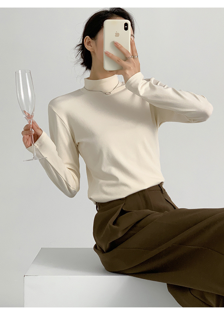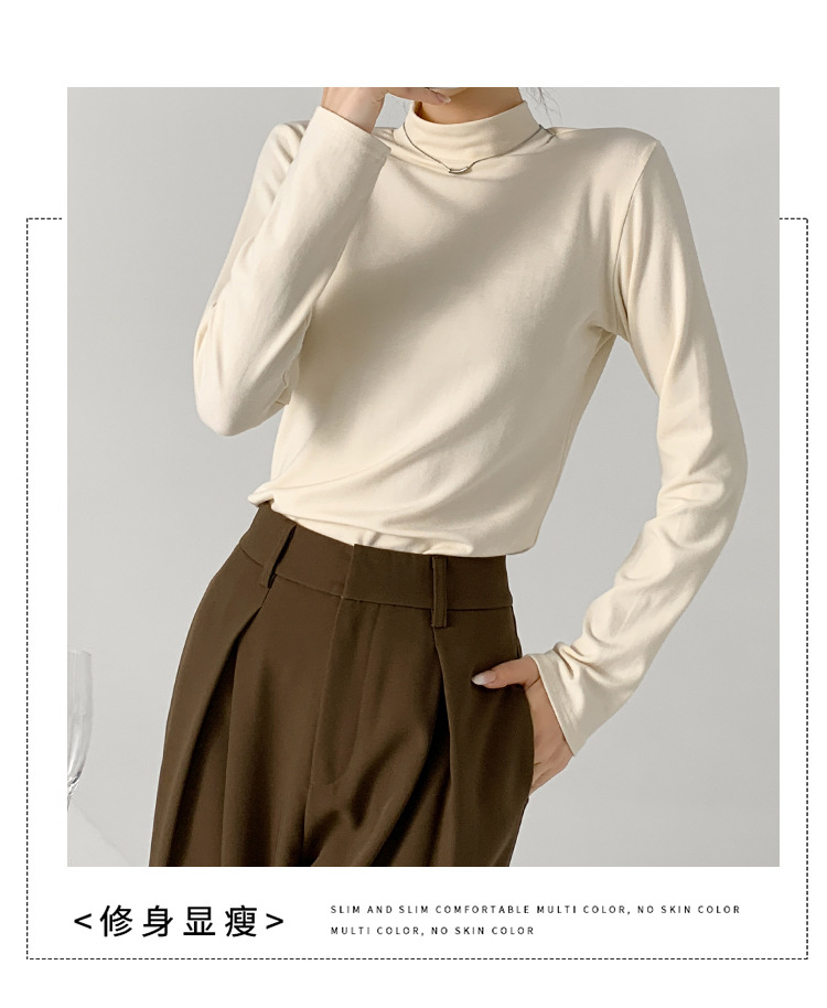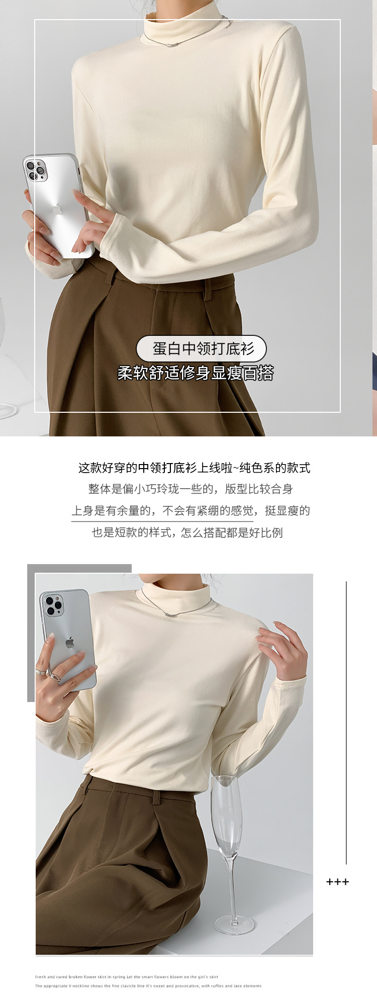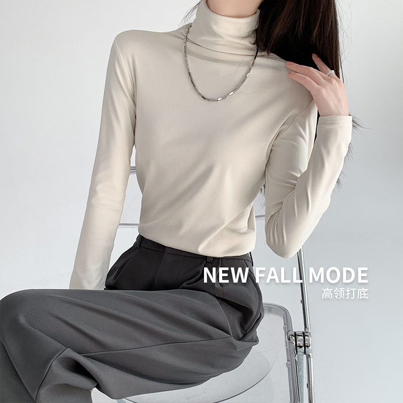 高襟の毛磨きの底のシャツの女性の春秋の新型の修身の中はやせている上着の純色の洋気の長袖のtシャツの女性のinsを現します。