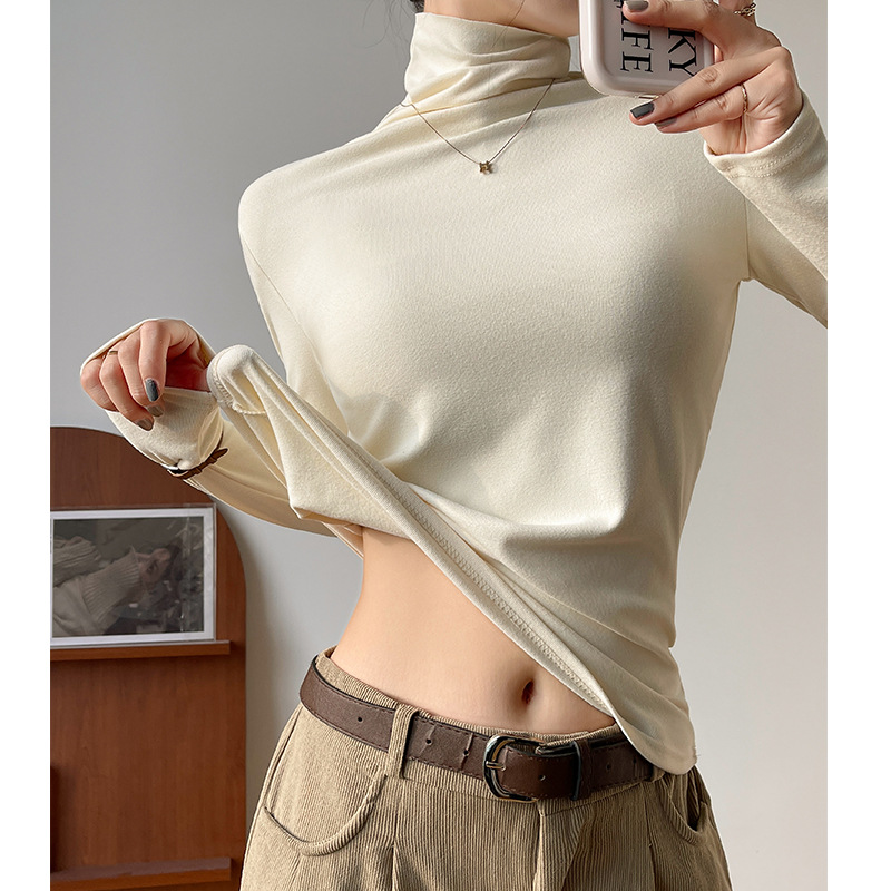 女性用無地タートルネックボトムシャツ、2025春秋新作、スタイリッシュなアプリコットカラーの長袖Tシャツ、起毛加工の快適なトップス