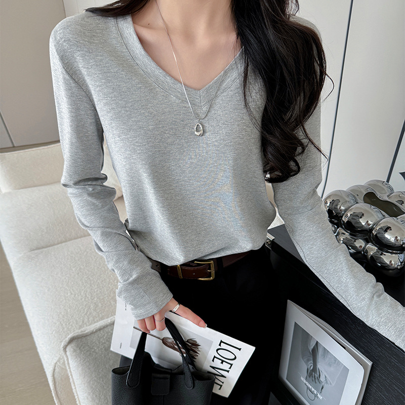 グレーvネック長袖tシャツ女性春秋2025新商品のゆったりとした修身シャツの中に高級感のある上着を着ます。