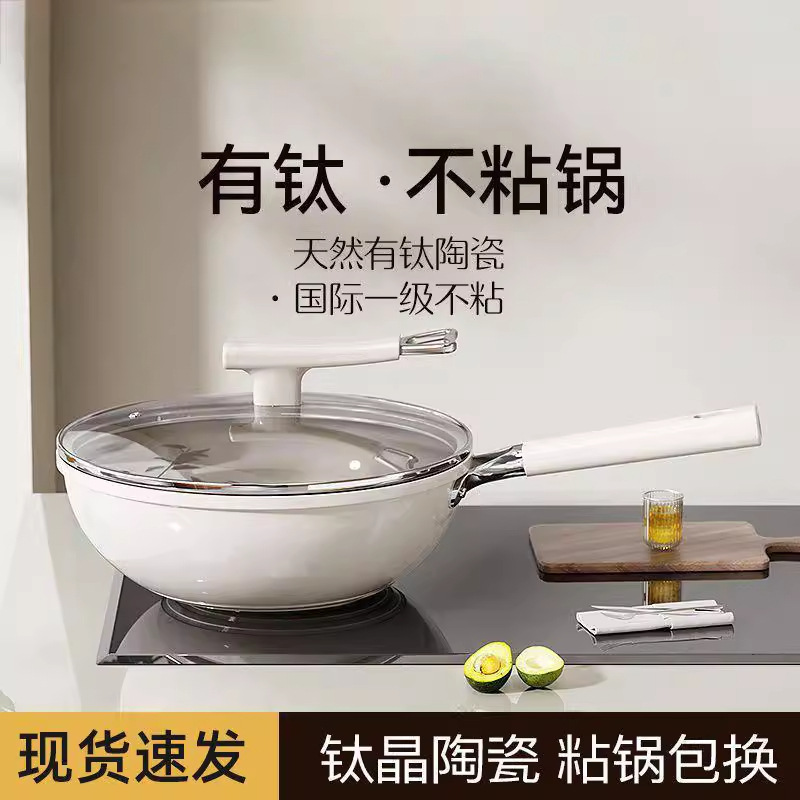 チタン陶磁器炒め鍋家庭用フライパン炒め鍋ミルク白色耐磨耗防止鍋通用かまどフライパン