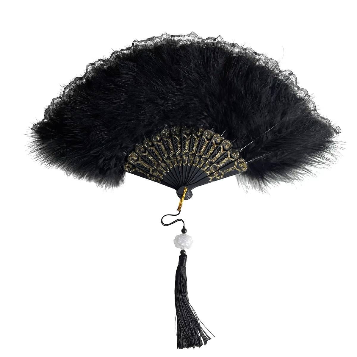 古風の羽の扇子のチャイナドレスの女性のショーの扇子の漢服の新年の黒いレースの扇子のダンスの扇子の復古の中国式