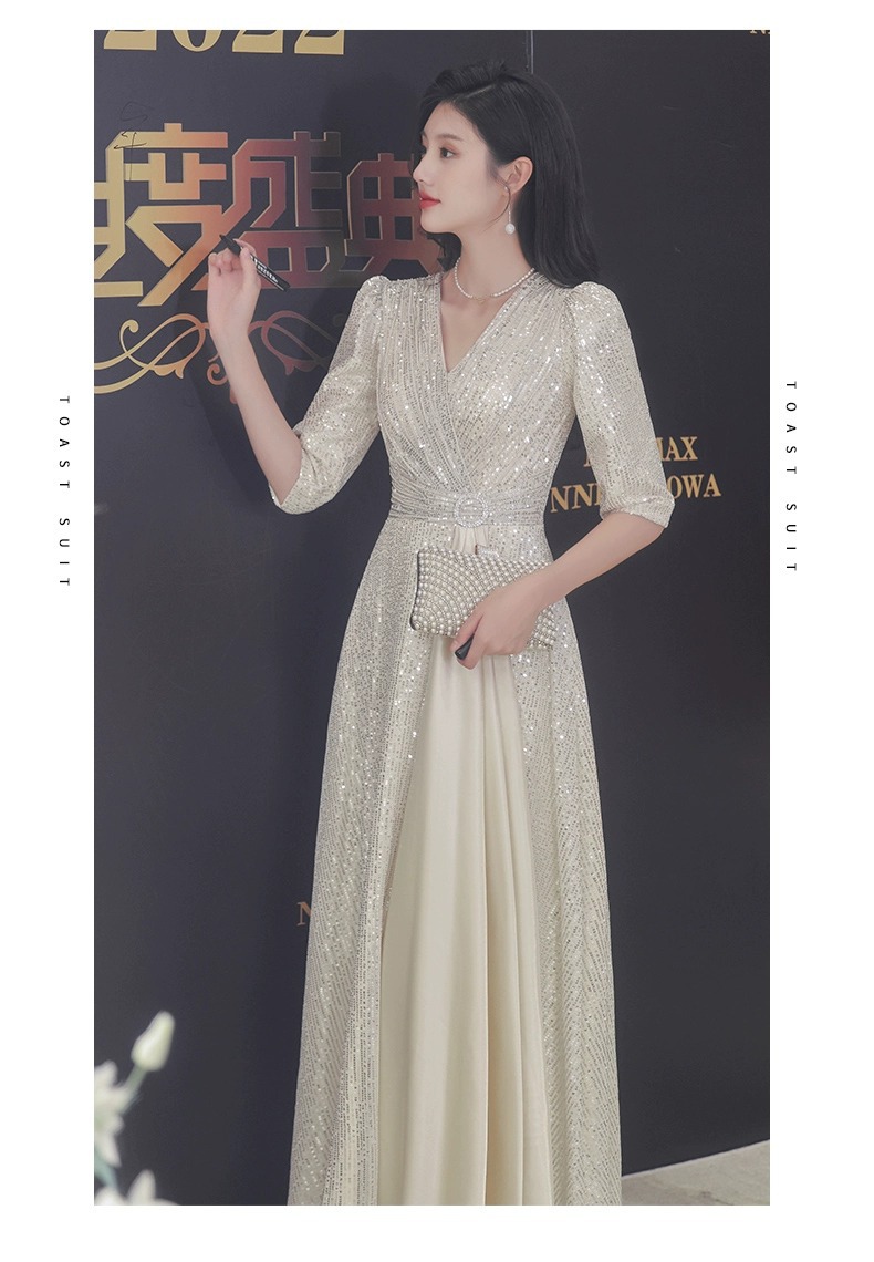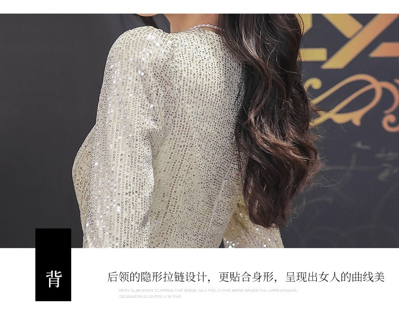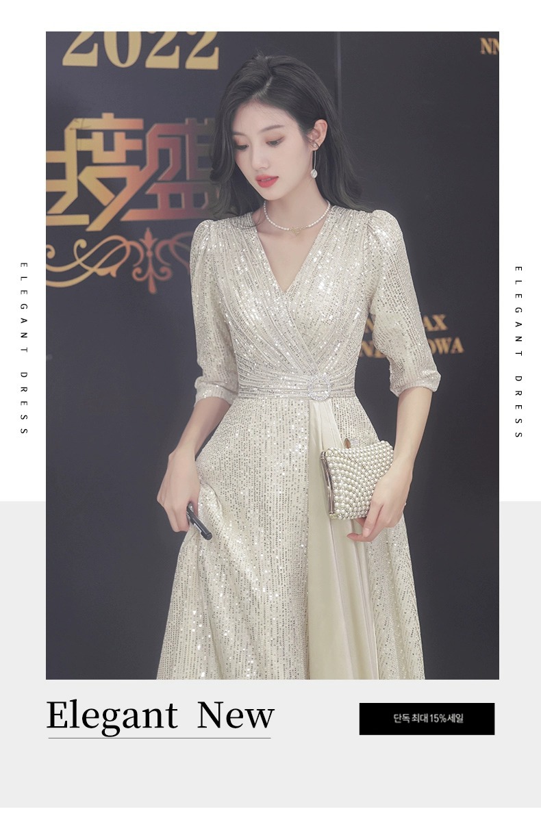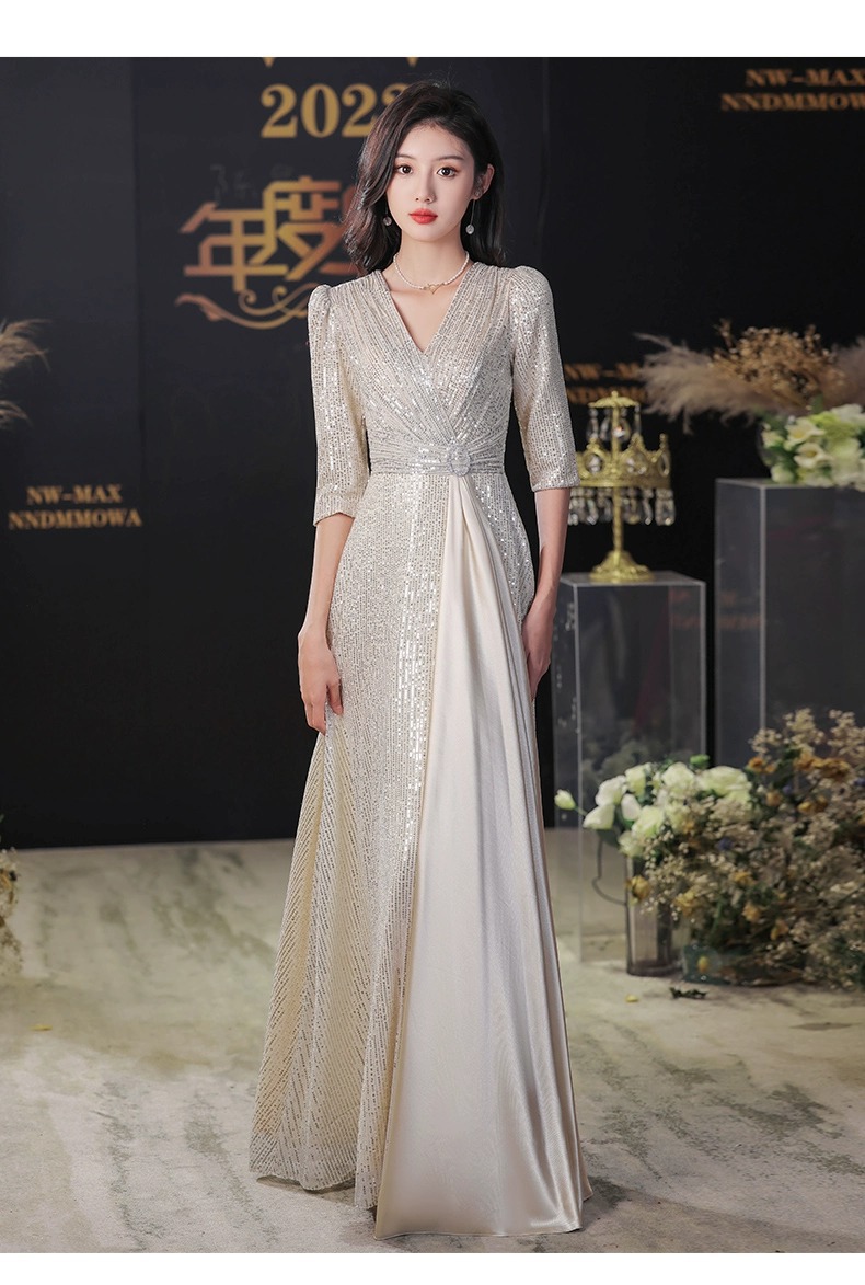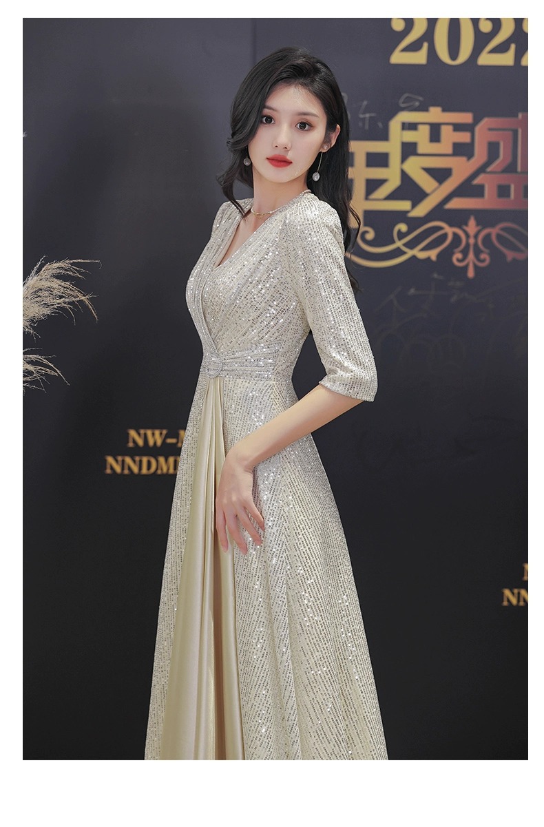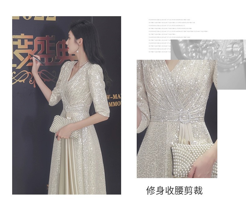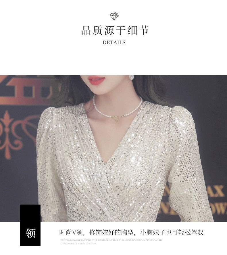 スパンコール付きイブニングドレス レディース 2025年新作 深Vネック 宴会 エレガント 個性的 年次総会 司会者 長袖イブニングドレス 卸売